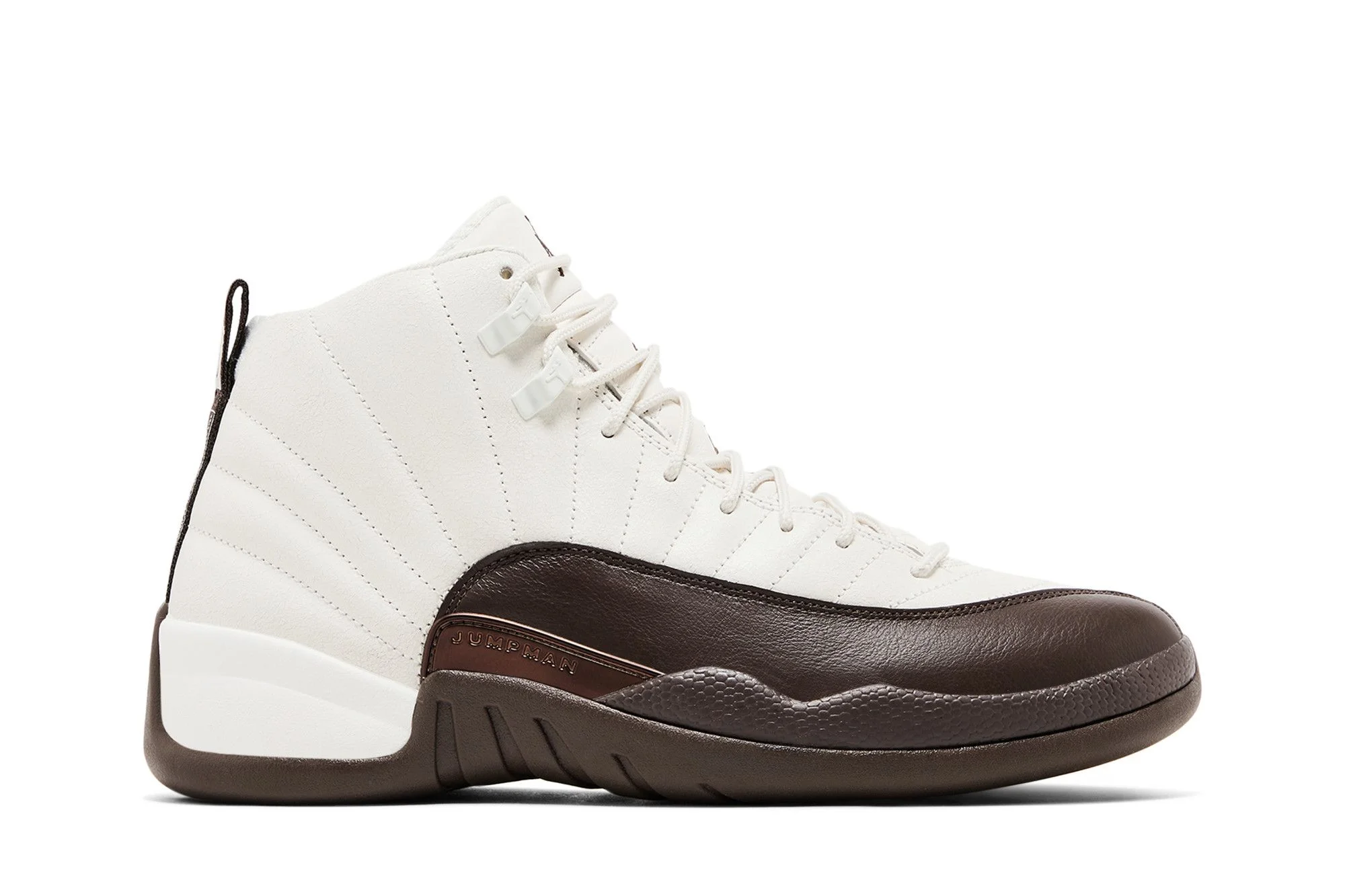 The SoleFly x Air Jordan 12 Retro SP 'Cafecito' delivers radiating stitched lines on the upper, crafted from cracked white leather with smooth leather mudguards in a chocolate brown hue. In addition to a brown Jumpman icon, each tongue is accompanied by 'Sole' and 'Fly' text. An SF logo appears on webbing pull tabs affixed to the heel. Underfoot, the brown rubber outsole reveals an exposed carbon fiber shank and patterned herringbone traction pods. UPPER MATERIAL Leather
