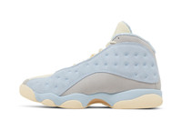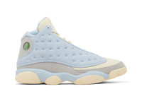 The SoleFly x Air Jordan 13 Retro 'I’d Rather Be Fishing' delivers the Miami retailer’s pastel-hued rendition of the legacy silhouette. The upper combines cream-colored ripstop textile with grey suede paneling and dimpled suede overlays in a powder blue finish. In addition to the 13’s signature holographic cat eye, branding elements include mismatched Jumpman and SoleFly insignias on each tongue and elephant-print sockliner. Underfoot, the panther paw outsole features a carbon fiber shank plate and herringbone traction pods in grippy gum rubber. UPPER MATERIAL Suede