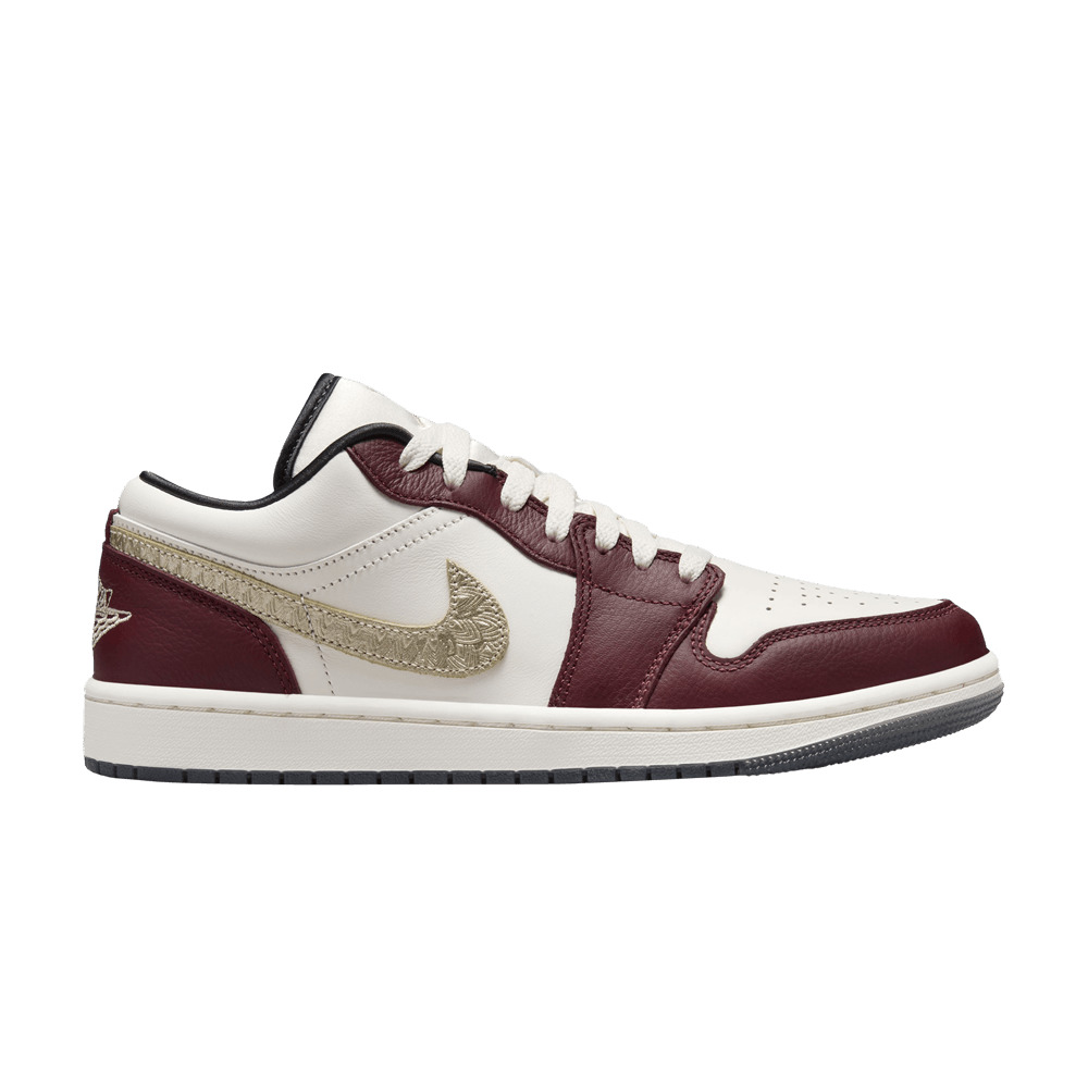 The Women's Air Jordan 1 Low SE 'Year of the Dragon' rings in the Lunar New Year with a unique design centered around the Chinese zodiac's mythological creature. The low-top carries a smooth leather upper, featuring an off-white base with burgundy overlays at the forefoot and heel. The latter displays a stitched Wings logo, while a textured Swoosh shines in a metallic gold finish. An embroidered Jumpman decorates the tongue. A translucent rubber outsole in Dark Smoke Grey underpins the low-profile silhouette. UPPER MATERIAL Leather
