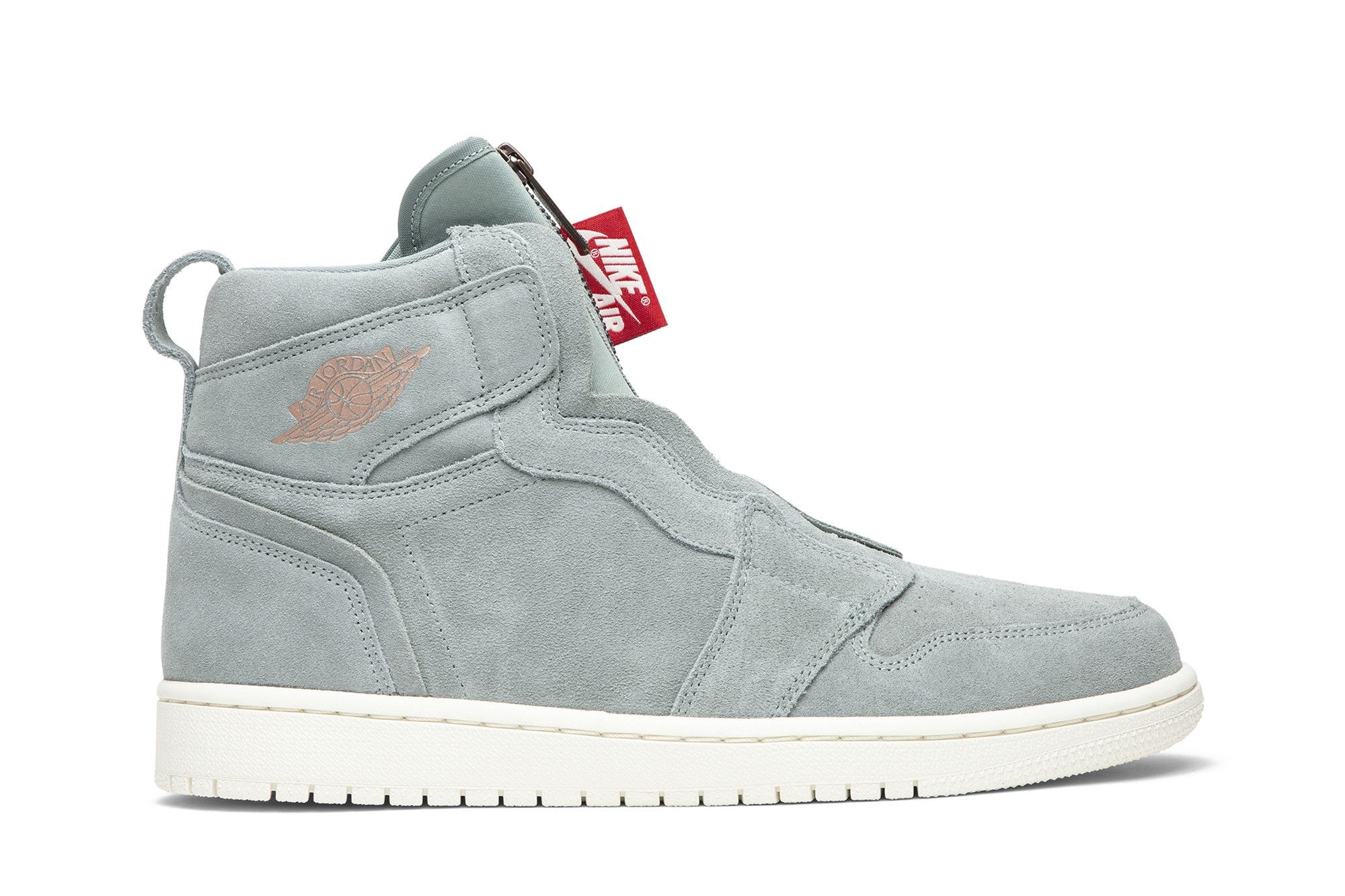 The women’s Air Jordan 1 Retro High Zip 'Mica Green' features a green soft suede upper with a metallic zipper in place of the classic Air Jordan 1 lacing system. “Nike Air” branding replaces the signature Swoosh, and red detailing on the lateral Wings logo finishes the look. UPPER MATERIAL Leather
