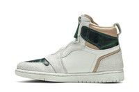 Defined by premium materials and a zip-up closure, the Wmns Air Jordan 1 Retro High Zip 'Mystic Green' sneaker reimagines the ’85 court icon with a bold aesthetic. Released in June 2019, this women’s exclusive features a mix of different textured leathers throughout its build—contrasting smooth panels with distressed, crackled-treated leather. The predominantly white build is highlighted by a Mystic Green perforated toe box and ankle overlay, with Beige accenting the collar and heel. Swoosh logos are removed in favor of a tag along the lace guard, while a zipper closure replaces the traditional lace system. UPPER MATERIAL Leather