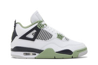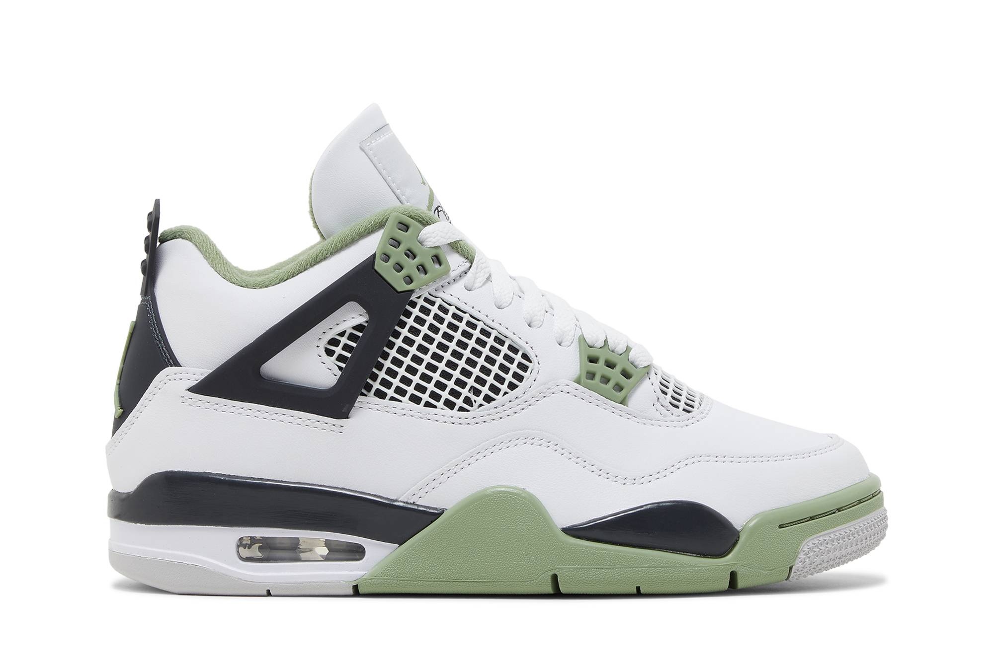 The Women’s Air Jordan 4 Retro ’Seafoam’ combines OG-inspired color blocking, reminiscent of the original ‘Fire Red’ release from 1989, with classic materials and refreshed pastel accents. The upper is constructed from smooth white leather with contrasting pops of Oil Green on the eyelets, interior lining, and the Jumpman branding hits that adorn the Flight tongue tag and molded heel tab. Legacy details are left intact, including the quarter panel netting and support wings. The classic silhouette rides atop a polyurethane midsole, featuring a visible Air-sole unit in the heel and a final splash of green throughout the forefoot. UPPER MATERIAL Leather