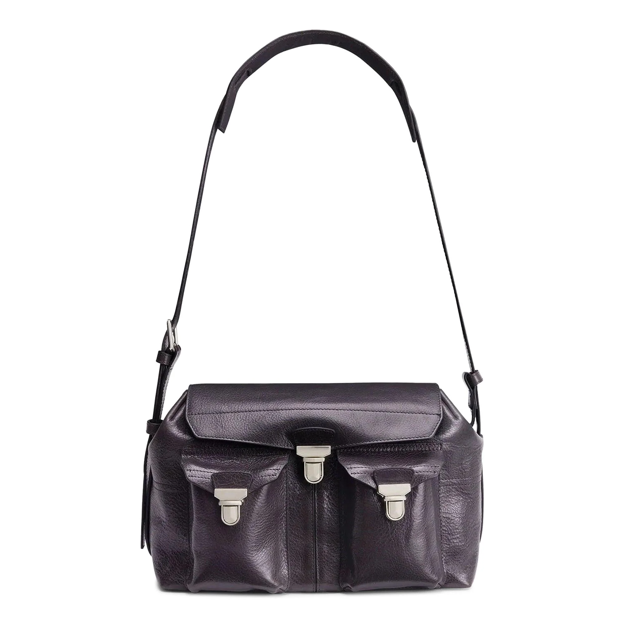 Inspired by Lemaire's utilitarian spirit, the Gear line borrows codes and details from vintage tool bags, notably its signature flap closure with metal clip clasp. This bag is made from glossy vegetable-tanned leather, LWG Gold certified. Featuring an adjustable shoulder strap and pockets, this medium bag is ideal for everyday use. DETAILS Medium Gear bag in glossy vegetable-tanned leather Elongated design with pockets Hand, shoulder, and crossbody carry Full-length, adjustable strap with metal buckle and loop Leather shoulder support Main flap and flap pockets with metal clip fasteners Embossed Lemaire logo at the back Zipped pocket at the back with metal slider and leather pull tab Zipper closure with metal slider and leather pull tab, with loop through strap Lemaire embossed interior leather label Reinforced bag bottom Silver-plated metalwork Dimensions: Length: 34 cm Height: 25 cm Depth: 16 cm Arrow height: 30 cm Strap length: 83 cm Made in Spain Style : BG0096 LL0067 FABRICS & CARE Main material: 100% cow Main lining 100% cow Do not wash Do not bleach Do not tumble dry Do not iron Professional leather clean only