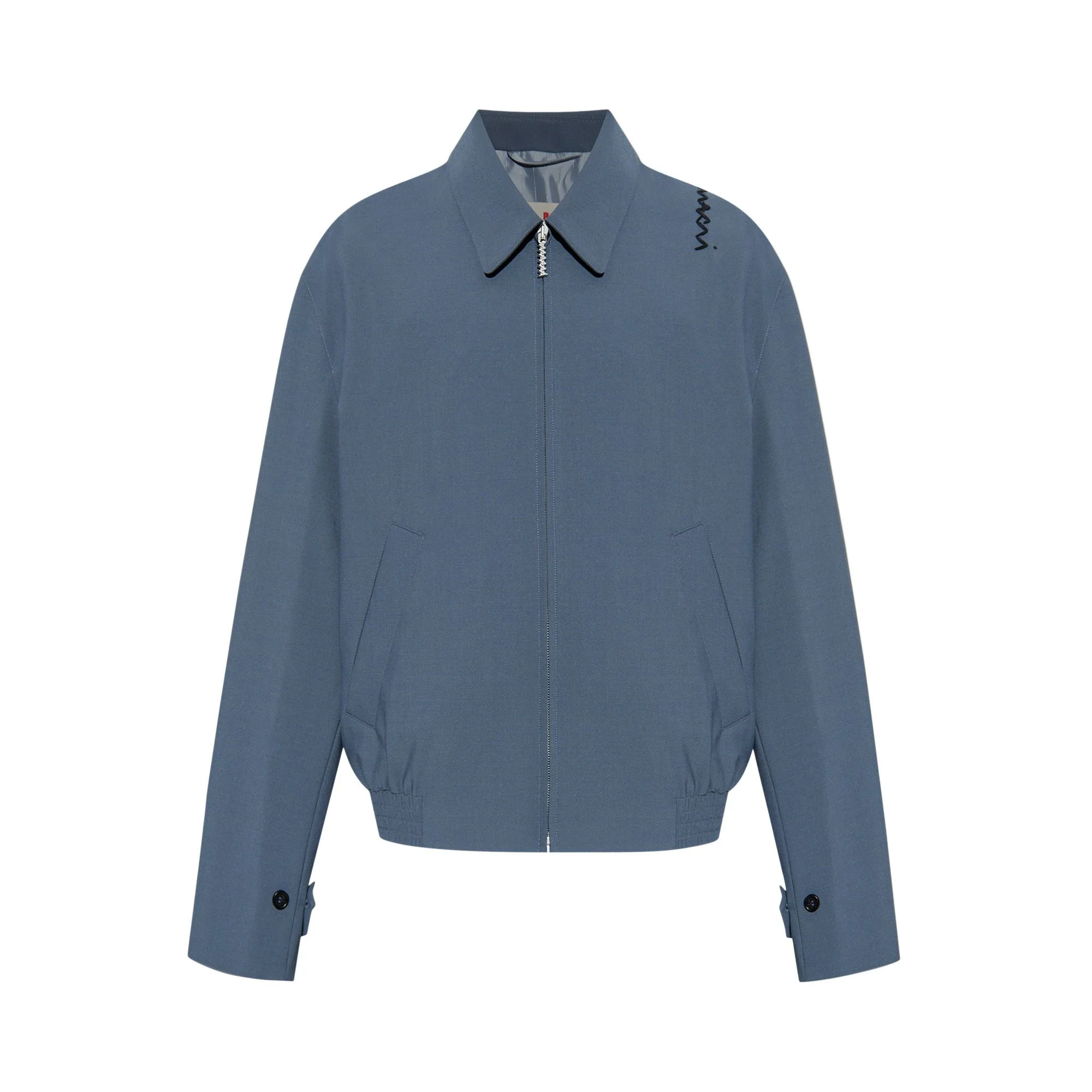 Jacket with shirt collar and concealed zip, made from a light wool blend. Regular fit with elasticated hem, adjustable buttoned cuff tabs and welt pockets. Marni Symbol details: hand-embroidered on the shoulder and zipper pull. Lined. Made in Italy MODEL JUMU0189S1UTP77100N63 COMPOSITION Primary Fabric: 53% Polyester Woven 43% Virgin Wool Woven 4% Elastan Woven - Lining: 100% Viscose-Rayon