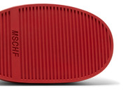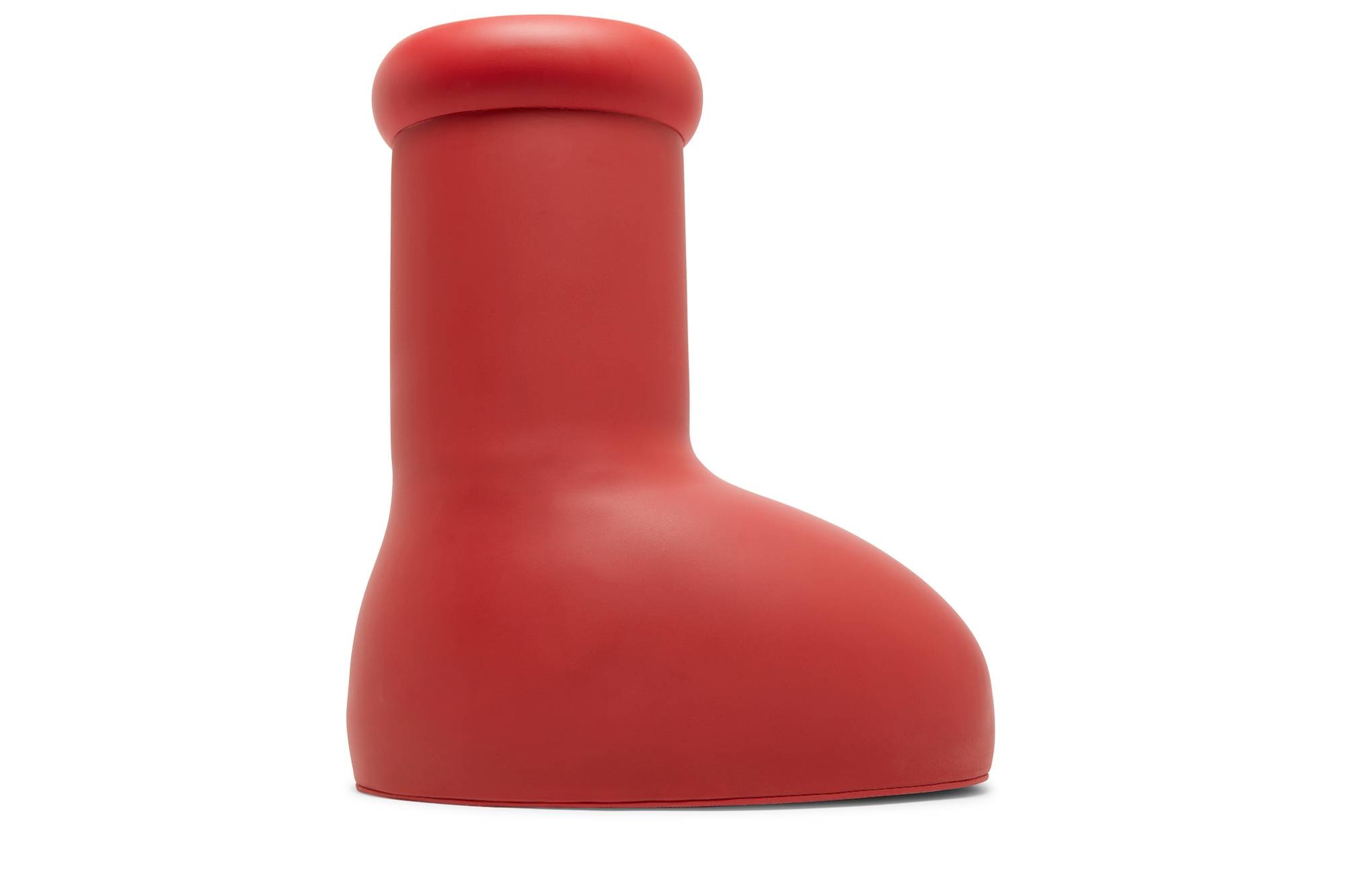 The MSCHF Big Red Boot presents a cartoonishly proportioned high-top from the Brooklyn-based creative collective known for whimsical and provocative footwear. A straightforward crimson hue suffuses the bulky boot, constructed with a single-mold-shell design and a sturdy TPU rubber shell. The bulbous silhouette features a padded collar that reaches midcalf, and a flat EVA outsole marked with horizontal treads and debossed MSCHF branding. UPPER MATERIAL Rubber