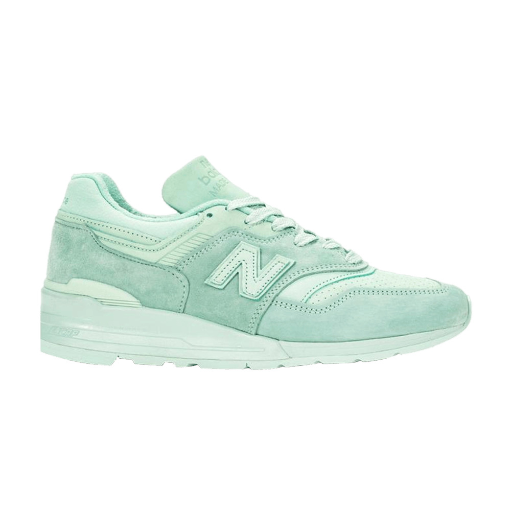 The New Balance 997 sneaker is a statement of signature visual language and modern functionality. Issued in March 2019, this iteration's monochromatic upper utilizes reinforced layers of 'Mint Julep' suede and leather inspired by the classic southern cocktail. The traditional lacing system and iconic brand insignias are dyed to match. An ENCAP-equipped midsole and rubber outsole continue the cool hue.