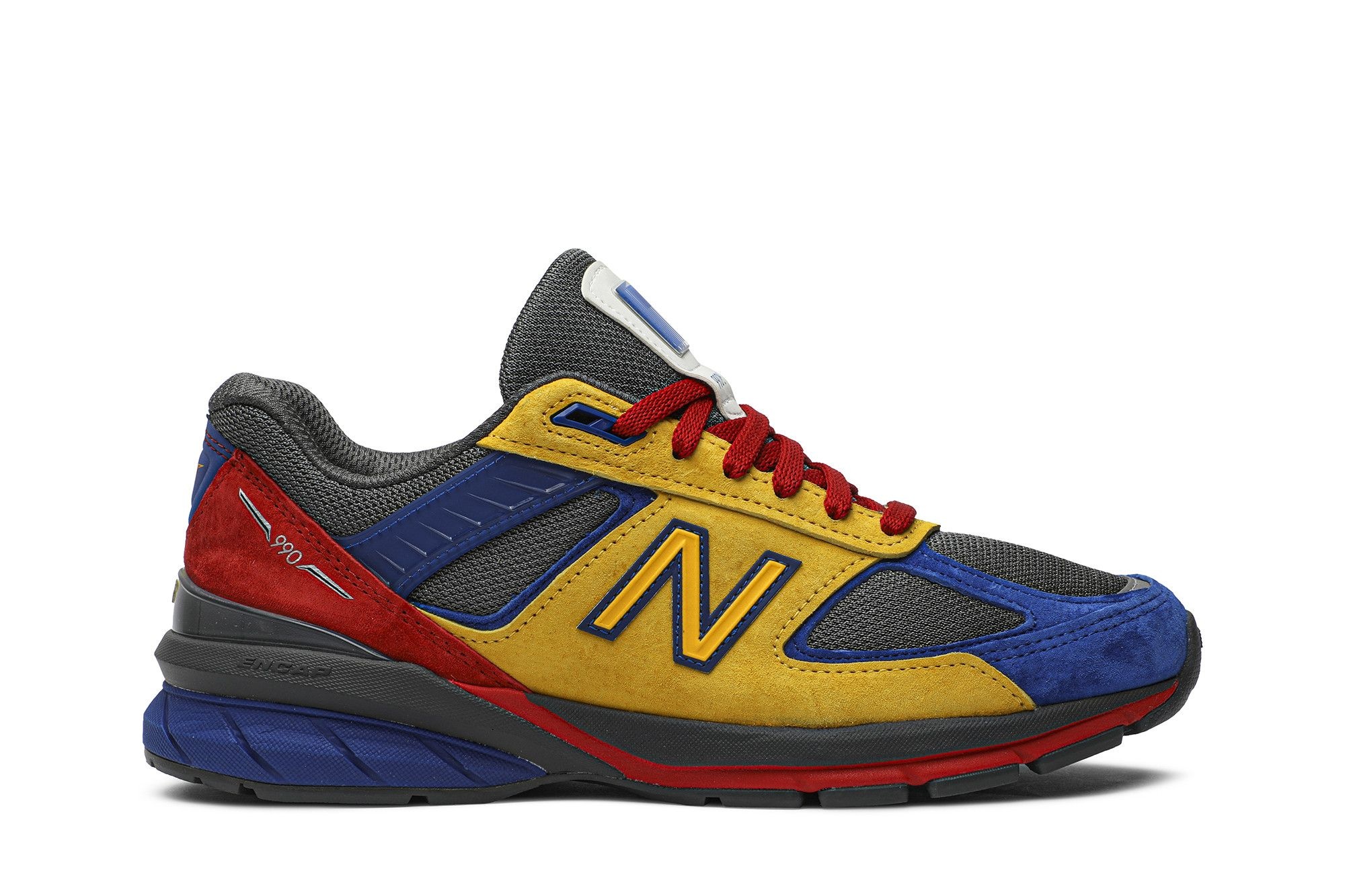 Debuted exclusively at Shoe City in November 2019, the EAT x New Balance 990v5 is reimagined in the Baltimore streetwear label's signature hues. The sneaker's mesh upper gives way to pigskin suede paneling in primary colors, molded synthetic stripes and a stability heel clip. Two-tone 'N' patches embellish the sides and custom branding remains on the tongue and counter. The distinctive palette is reiterated on Encap midsole and rubber outsole.
