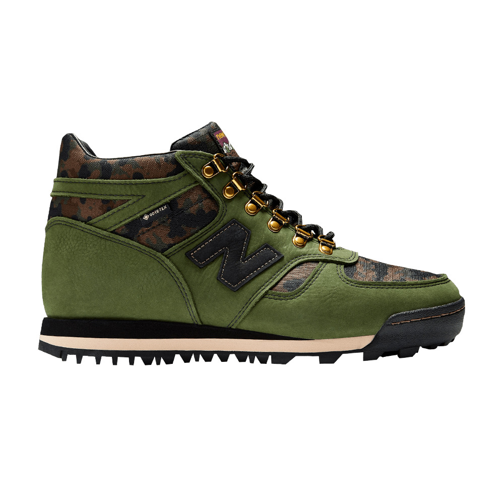 The Joe Freshgoods x New Balance Rainier ‘Lil’ Block’ delivers the Chicago-based designer’s stylish take on the outdoor silhouette. Joe Freshgood’s custom camo print is applied to the ripstop textile upper, reinforced with green nubuck overlays and secured with rope laces that feed through brass eyelets. A high-cut padded collar provides a comfortable fit, while a Gore-Tex membrane offers waterproof protection without sacrificing breathability. The archival model rides on a lightweight EVA midsole, supported underfoot by a rugged Vibram outsole. UPPER MATERIAL Nubuck