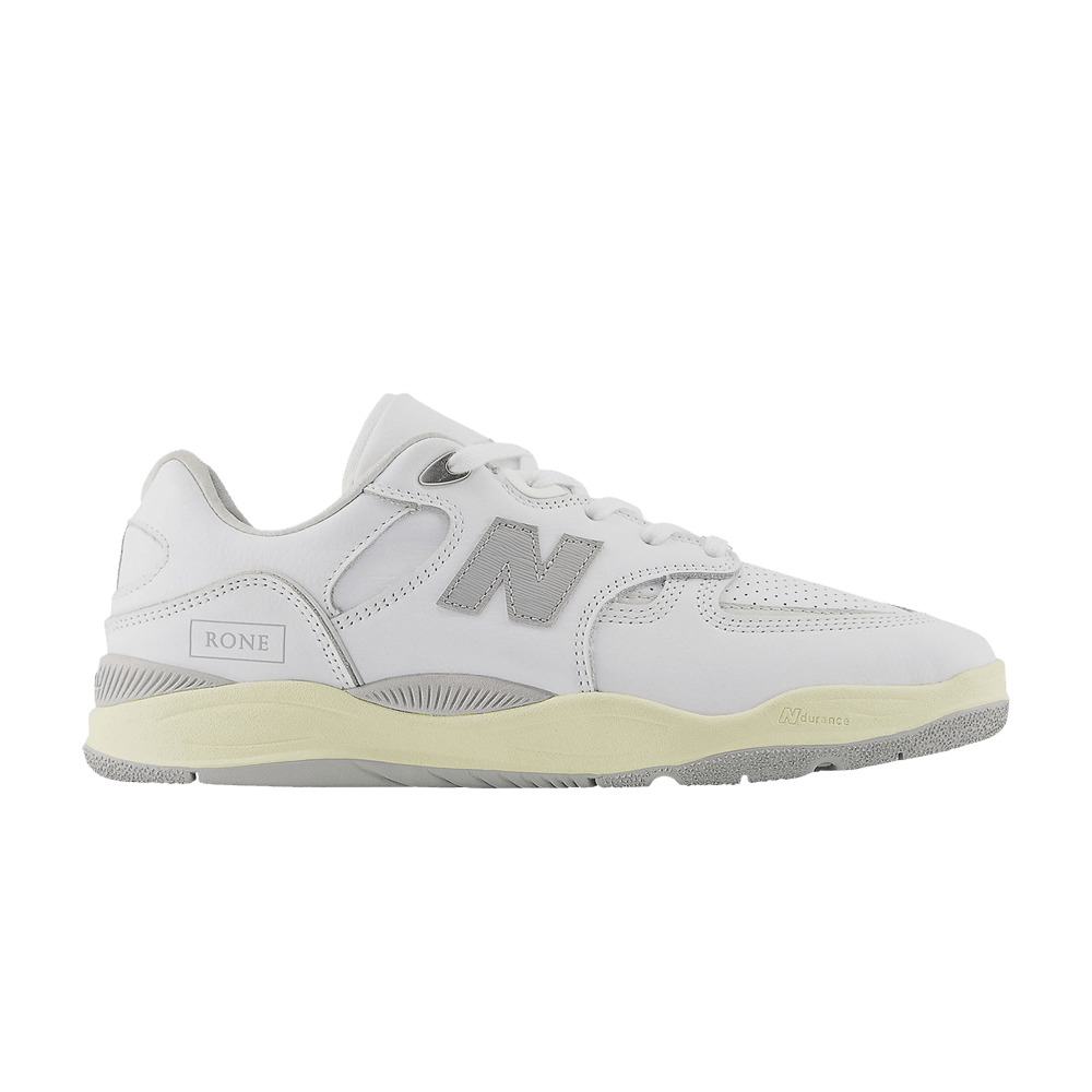 The Rone x Tiago Lemos x New Balance Numeric 1010 ‘Sophisticated Skateboarding’ delivers a technically advanced silhouette clad in neutral tones. Designed in collaboration with Rone Footwear, Tiago Lemos’ signature model utilizes New Balance’s FantomFit upper, featuring white full-grain leather fused with lightweight performance mesh. Branding elements include a textured grey leather ‘N’ logo, ‘Rone’ metallic silver lace dubrae, and a Rone wordmark stamped on the lateral heel. The low-top rides on a dual-density FuelCell midsole, rendered in a pre-yellowed finish and supported by a durable grey rubber outsole. UPPER MATERIAL Leather