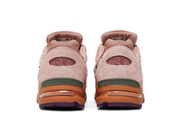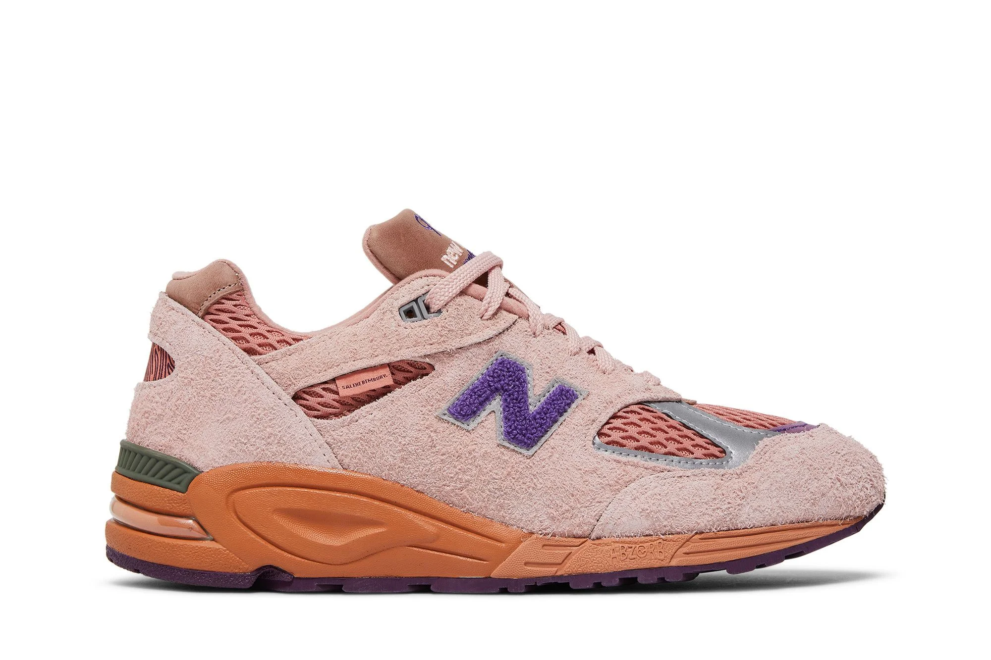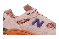 The Salehe Bembury x New Balance 990v2 Made in USA ‘Sand Be The Time’ continues the creative partnership between the prolific footwear designer and Boston-based sportswear brand. Their fifth joint venture presents a pastel colorway of the retro lifestyle runner, featuring pink hairy suede paneling with tonal open-cell mesh at the toe box and collar. A purple chenille ‘N’ logo decorates the quarter panel, while Bembury’s signature fingerprint graphic appears on the back heel. The layered build rides on a salmon-colored ABZORB midsole, reinforced underfoot by a durable purple rubber outsole. UPPER MATERIAL Suede