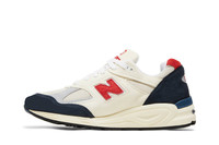 The Teddy Santis x New Balance 990v2 Made in USA ‘Navy Sea Salt’ treats the lifestyle runner to a patriotic makeover. The upper is composed of breathable off-white mesh with a tonal midfoot overlay accented with a scarlet ‘N’ logo. Navy suede overlays reinforce the forefoot and heel, with the latter featuring a reflective silver insert marked with ‘USA’ in embroidered red lettering. The sneaker is mounted on New Balance’s ABZORB midsole, highlighted by sculpted sidewalls in a vintage ivory finish. UPPER MATERIAL Suede