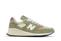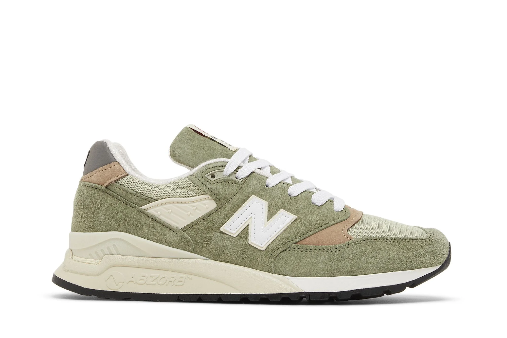 The Teddy Santis x New Balance 998 Made in USA ‘Olive Incense’ features a pastel green mesh upper with tonal pigskin suede overlays. Tan nubuck detailing appears at the toe box and heel, while a white leather ‘N’ logo adorns the quarter panel. Additional branding elements include a Flying NB logo on the woven tongue tag and matte silver back tab. The lifestyle runner sits atop a lightweight ABZORB midsole, supported underfoot by a durable black rubber outsole. UPPER MATERIAL Suede