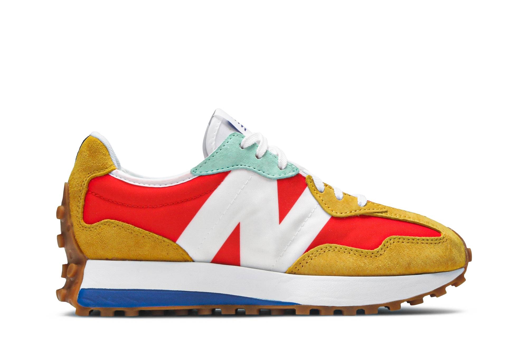 The women’s New Balance 327 ‘Neo Flame’ showcases vibrant hues on a retro-inspired silhouette that blends elements from the 320, 355 and Supercomp models. Split color blocking distinguishes the upper, featuring a red canvas base with yellow suede overlays and oversized ‘N’ branding on the lateral side. The opposite side combines a grey canvas base with contrasting suede overlays in mint green and black. A gum rubber outsole provides grippy traction underfoot. UPPER MATERIAL Nylon