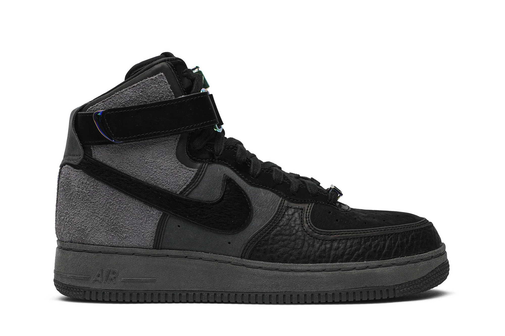 James Whitner of A Ma Maniere brings shape to his creative ethos of cultural reverence with the Nike Air Force 1 High from the 'Hand Wash Cold' pack. Arrived in December 2019, the sneaker blends black tumbled leather, nubuck and hairy suede on the upper. Reflective underlays, pony hair Swooshes and iridescent hardware remix the iconic design. A logo initial to the heel and bicolor rubber cupsole charged with Air cushioning unite the capsule.