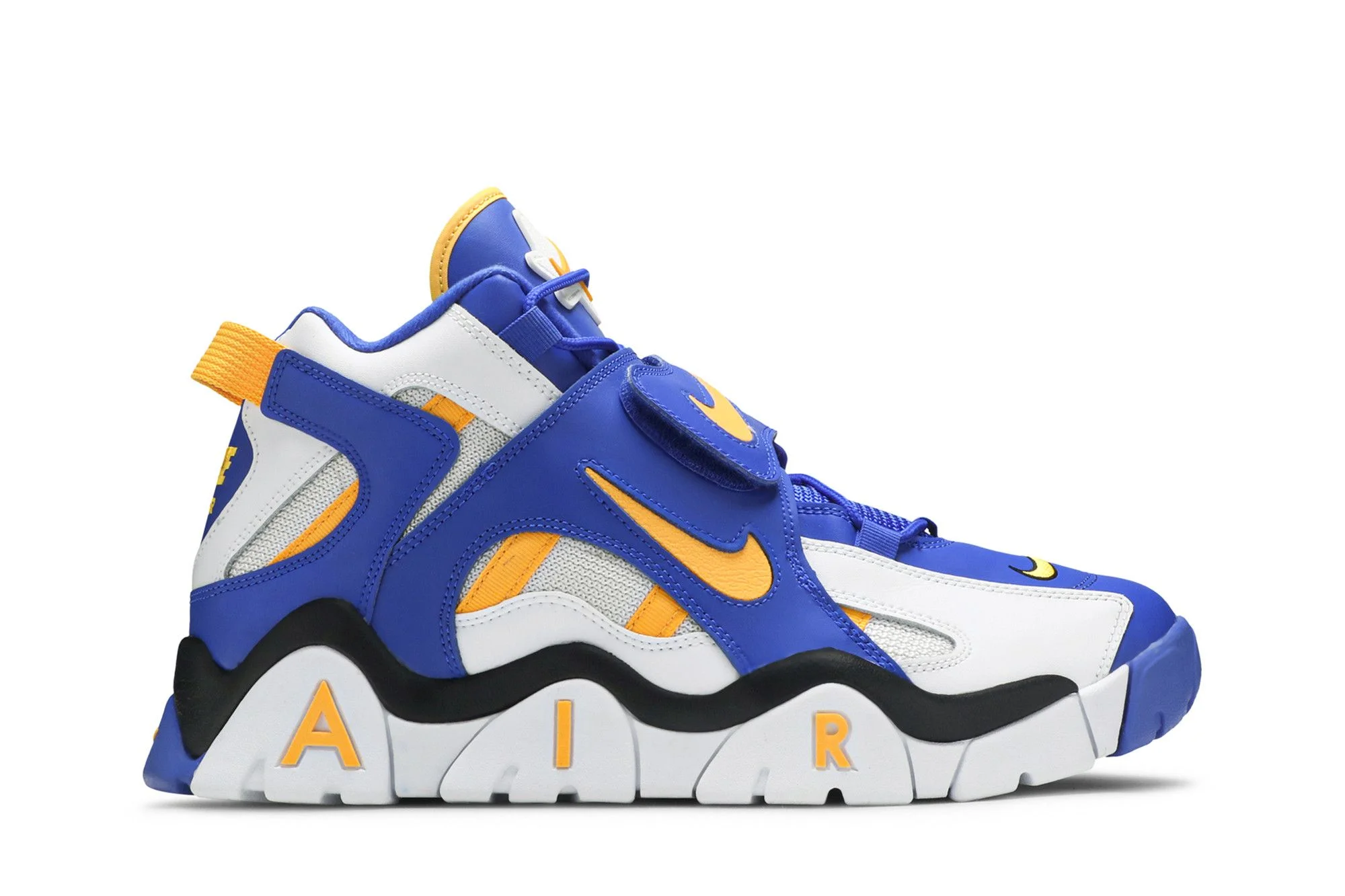 Introduced in September, 2019, the Nike Air Barrage Mid 'Racer Blue' comes in a colorway honoring the Golden State Warriors. Following up the Toronto Raptors version released in summer to honor the NBA champs of that season, this fall iteration includes elements of gold and white to acknowledge the repeat winners from '17-'18. Built with layered support and Air cushioning, the 1995 sneaker is best known as the training shoe of NFL Hall-of-Famer Marshall Faulk and many other top football players.