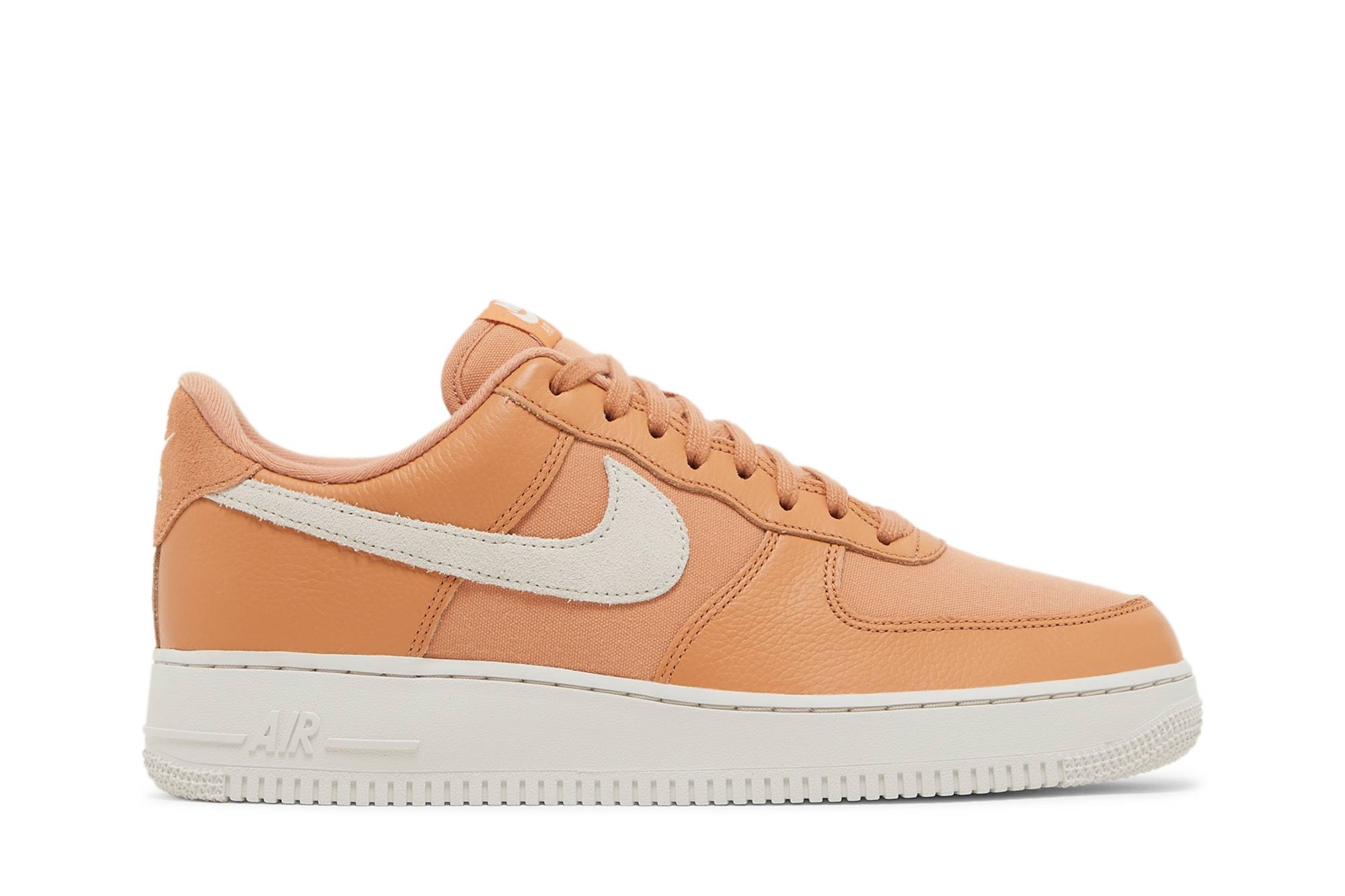 The Nike Air Force 1 ‘07 ‘Amber Brown’ utilizes a rosy beige hue on the upper, built with a combination of breathable canvas and tumbled leather. In addition to an ivory-colored suede Swoosh, branding elements include a woven Nike tag atop the tongue and a Nike wordmark embroidered on the back tab. Anchoring the low-top is an off-white rubber cupsole, enhanced with an Air-sole unit encapsulated in a lightweight polyurethane wedge. UPPER MATERIAL Leather