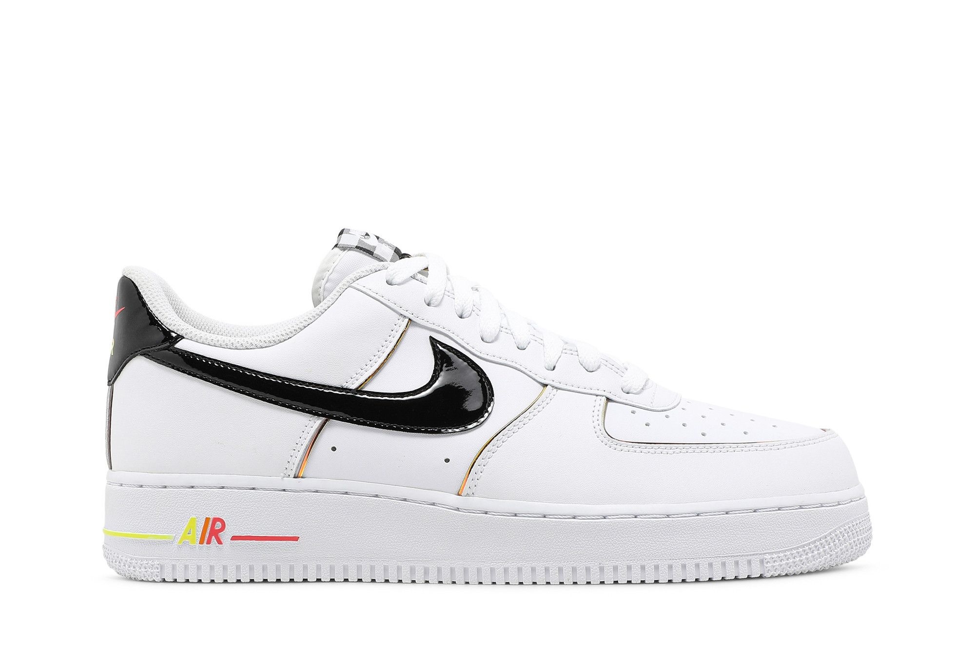 The Nike Air Force 1 '07 LV8 ‘Fresh’ treats the classic silhouette to a design refresh with eye-catching accents. The upper is constructed from white leather with a metallic iridescent trim outlining the sneaker’s various overlays. Glossy black patent leather is utilized on the Swoosh and heel tab, marked with a standard Nike Air logo in gradient yellow and red coloring. A similar color-fade effect is applied to the lace aglets and raised Air branding on the midsole. UPPER MATERIAL Leather