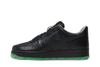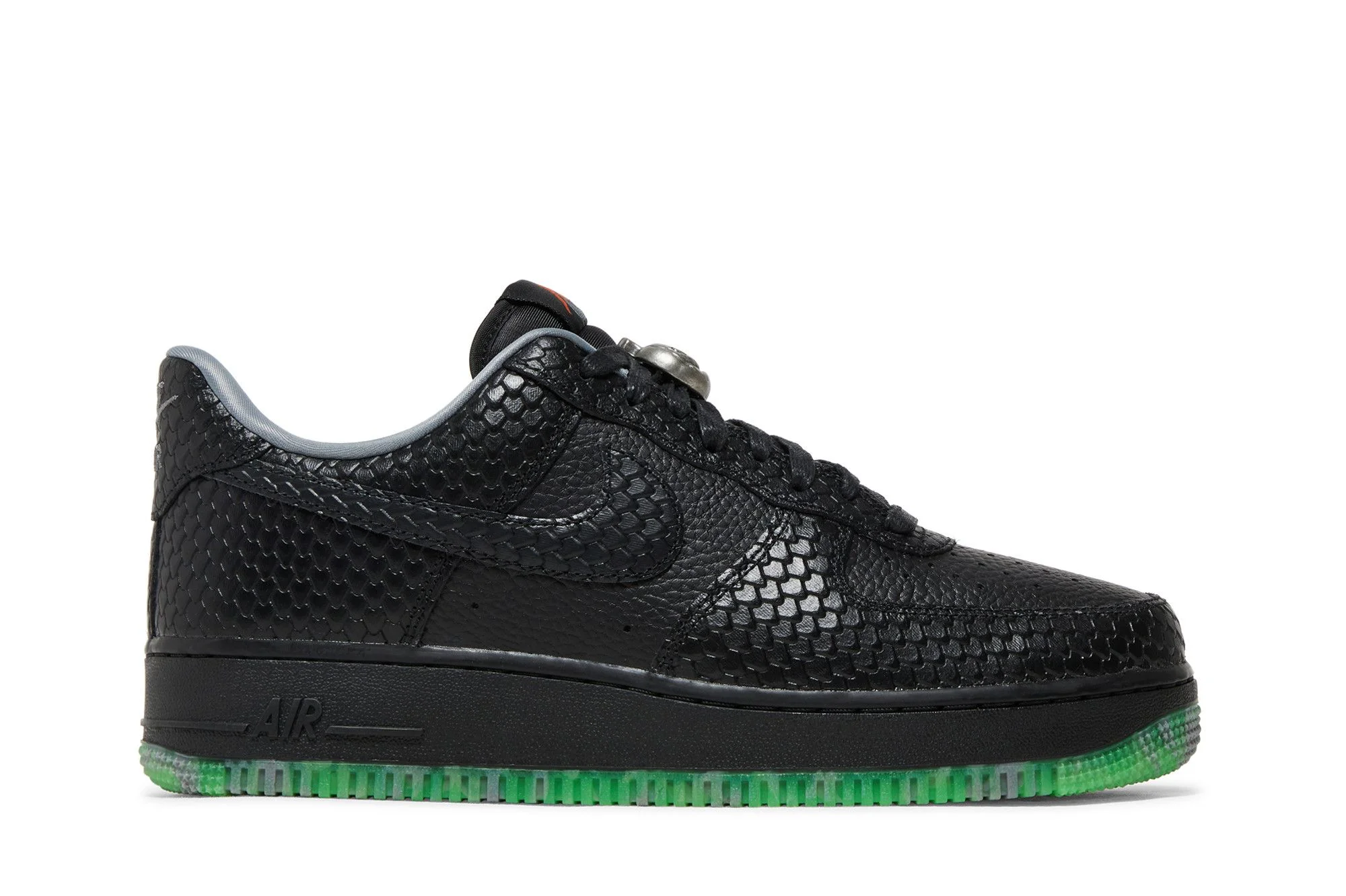 The Nike Air Force 1 Low Premium ‘Headless Horseman’ celebrates Halloween with a pitch-black tumbled leather upper with tonal snakeskin-textured overlays at the forefoot and heel. Waxed black laces are decorated with silver Jack-o’-lantern dubrae, while custom sockliners depict an illustrated Jack-o’-lantern set against a haunted forest backdrop. An orange Nike tag atop the tongue provides a discreet pop of color. The low-top is mounted on a durable rubber cupsole, highlighted by black sidewalls and a marbled rubber outsole in a vivid Green Strike hue. UPPER MATERIAL Leather