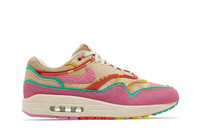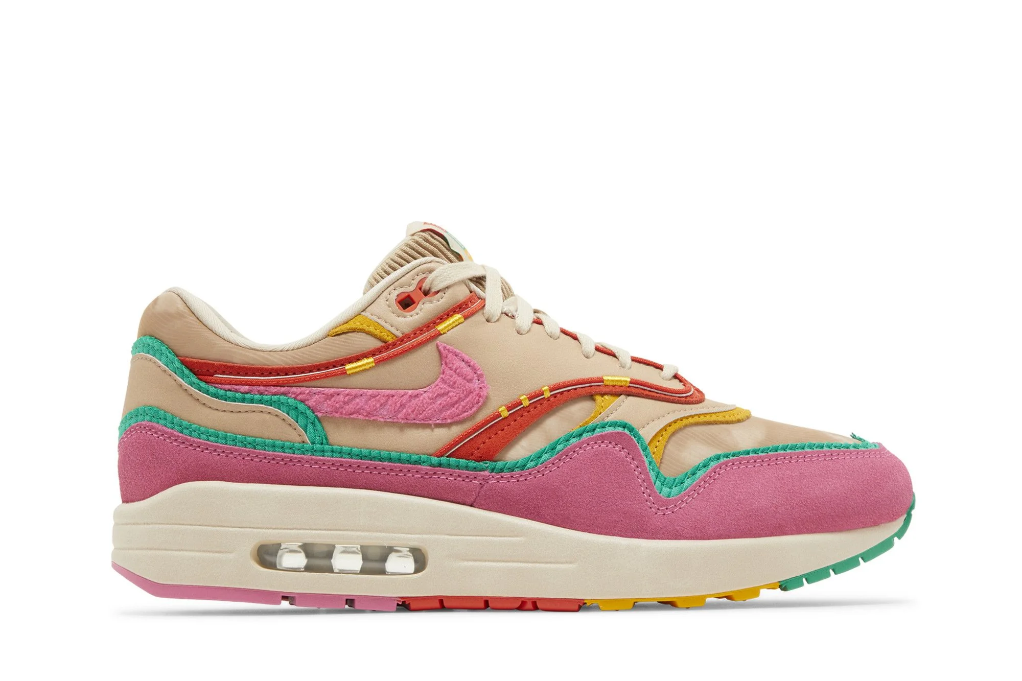 The Nike Air Max 1 ‘Familia’ celebrates young Latina women with a colorful interpretation of the lifestyle running shoe. A pink Swoosh in textured textile adorns the upper, crafted from tan leather and outlined in red piping with yellow deco stitching. Outlined in green textile trim, the suede mudguard is rendered in a vibrant pink hue, matching the Nike Air logo stamped on the back heel. ‘Familia’ branding appears on the right tongue tag and sockliner. The sneaker rides on an off-white polyurethane midsole, fitted with visible Air-sole cushioning and supported by a multicolor rubber outsole. UPPER MATERIAL Suede