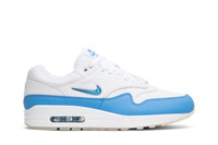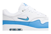 The Nike Air Max 1 Premium SC Jewel ‘University Blue’ revives a fan-favorite detail, the jewel Swoosh, rendered here in University Blue. The pastel shade is repeated on the leather mudguard and Nike Air branding on the tongue and heel, as well as the silhouette’s signature Air sole unit. Crisp white is used on the leather upper and midsole, while the translucent rubber outsole reveals a printed large Swoosh underneath.