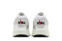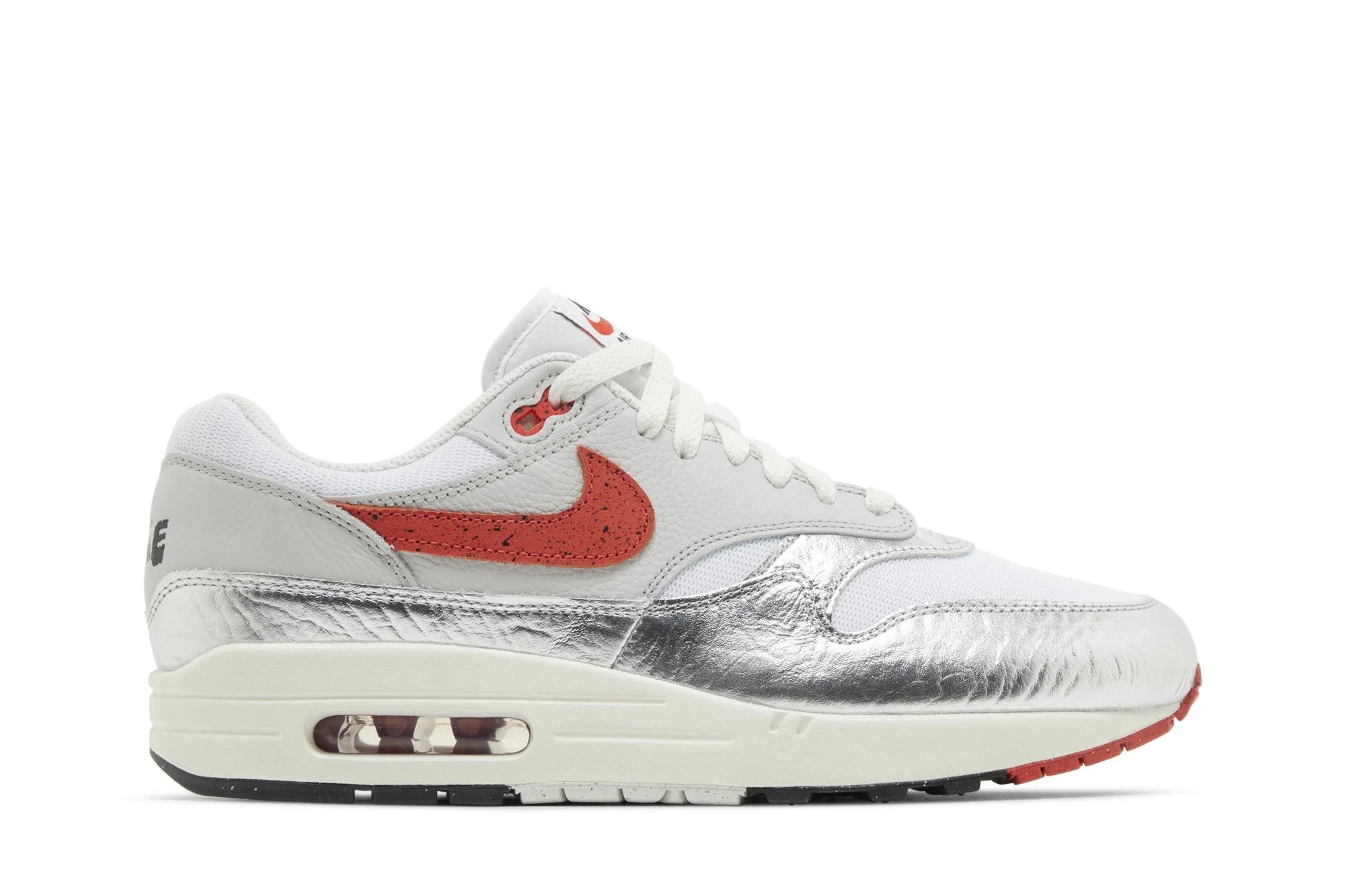The Nike Air Max 1 Premium SE 'Hot Sauce' combines breathable white mesh with off-white tumbled leather overlays. The leather Swoosh is rendered in a vibrant orange finish, complete with hot sauce-speckled detailing. Inspired by aluminum foil, crinkled leather in a metallic silver finish covers the mudguard. A chili pepper graphic is integrated into a Nike wordmark stamped on the back heel. The cushioning setup takes the form of a white polyurethane midsole with a visible Air-sole unit nestled in the heel. UPPER MATERIAL Leather