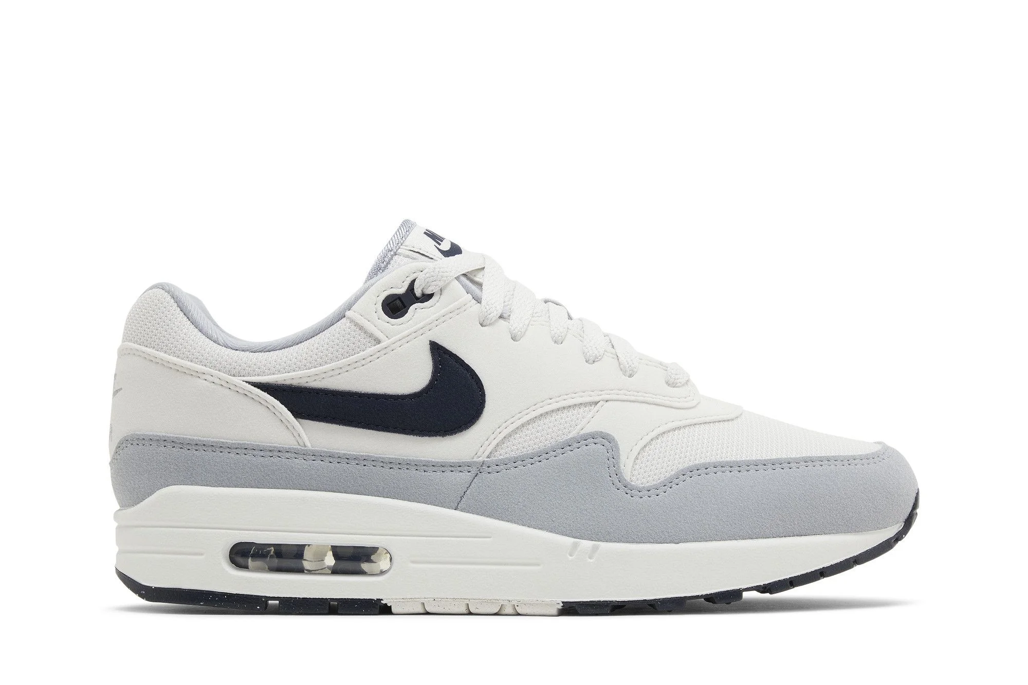 The Nike Air Max 1 'Pure Platinum Dark Obsidian' features tonal synthetic suede overlays throughout the midfoot and heel. A light grey finish distinguishes the wavy mudguard, while contrasting hits of navy appear on the leather Swoosh and molded TPU eyelets. Anchoring the sneaker is a white polyurethane midsole with a visible Max Air unit nestled in the heel. UPPER MATERIAL Suede