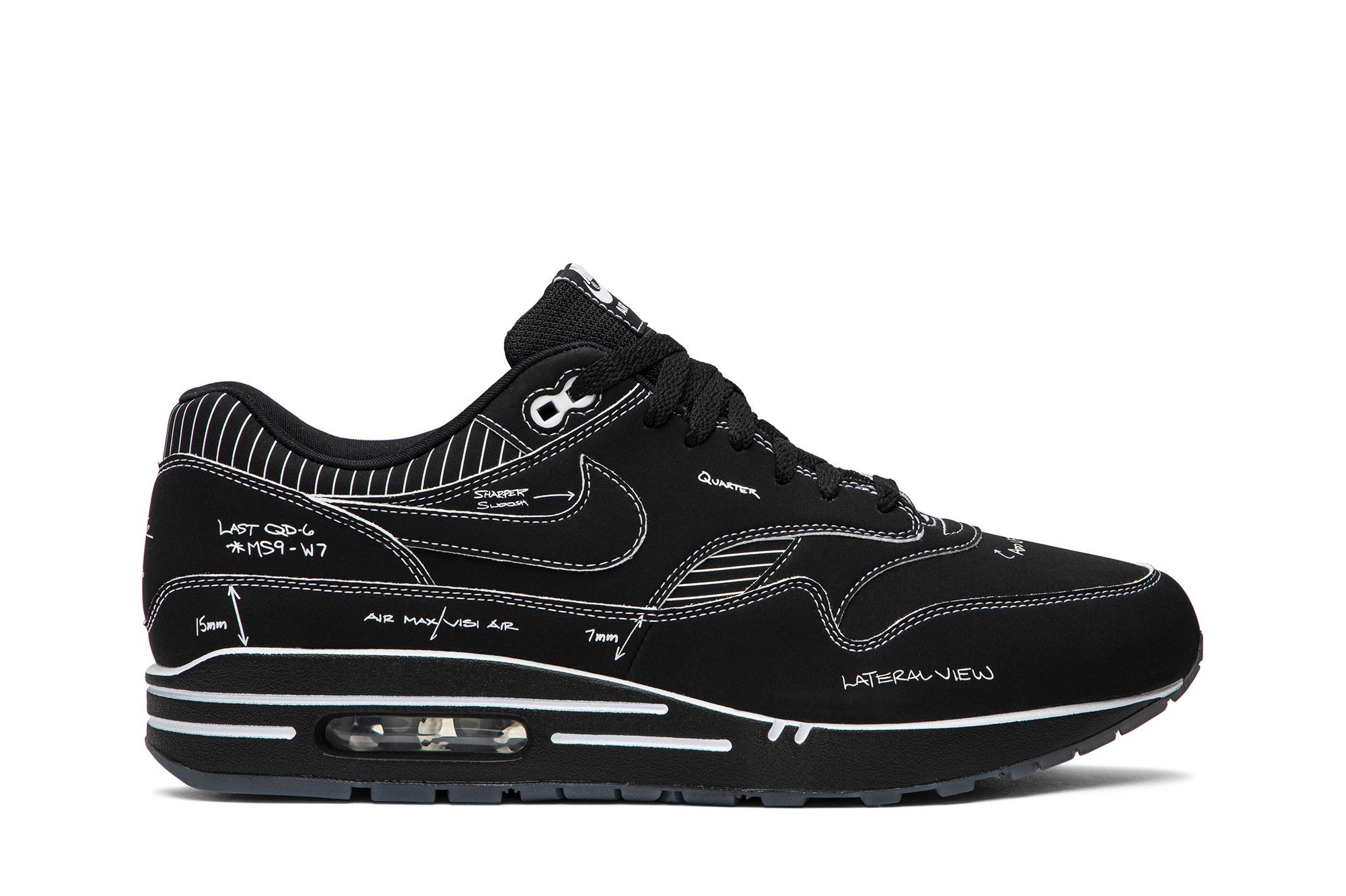 The Nike Air Max 1 'Sketch To Shelf - Black' pays tribute to the Air icon's historic creation with a look inspired by Tinker Hatfield's original sketch from July 26, 1986. The August 2019-released shoe features a matte black upper with symbols and notes in Hatfield's handwriting. Hatfield's detail-oriented practice is evident in measurements and phrases including 'Add U-Throat' and 'Faster Toe Box.' The words 'Sample, Property of Nike, Not For Resale' can be seen on the sockliner, lending an exclusive feel.