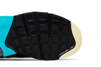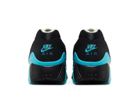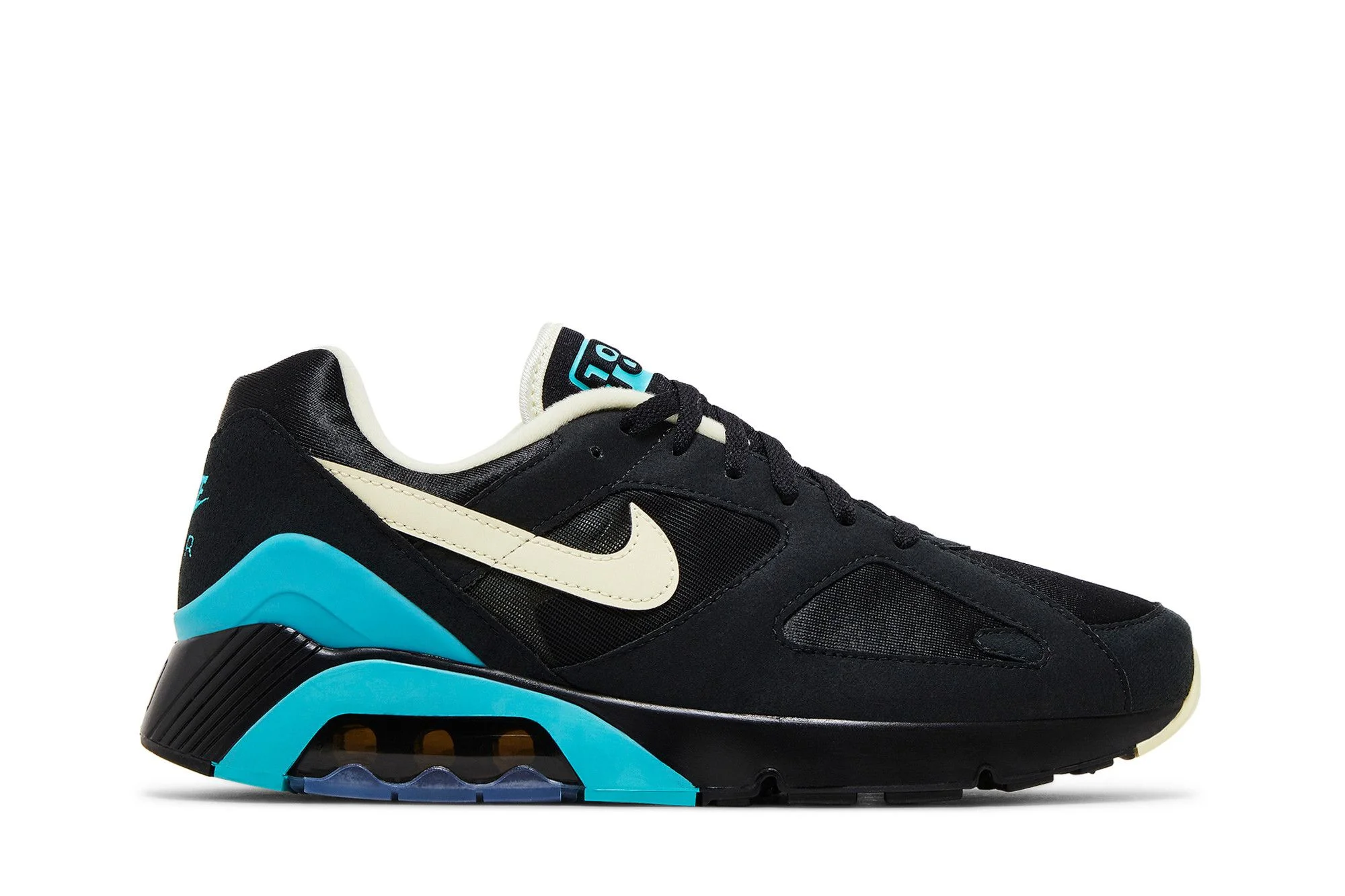 The Nike Air Max 180 'Black Dusty Cactus' showcases a cream-colored leather Swoosh across a black textile upper, bolstered with tonal suede overlays and a TPU heel counter in a bright teal finish. The latter hue is repeated on the 180 Air tongue tag and the Nike Air logo embroidered on the back heel. The sneaker rests on a solid black polyurethane midsole, contrasted by a teal frame surrounding the revolutionary 180-degree Air Max unit. UPPER MATERIAL Mesh