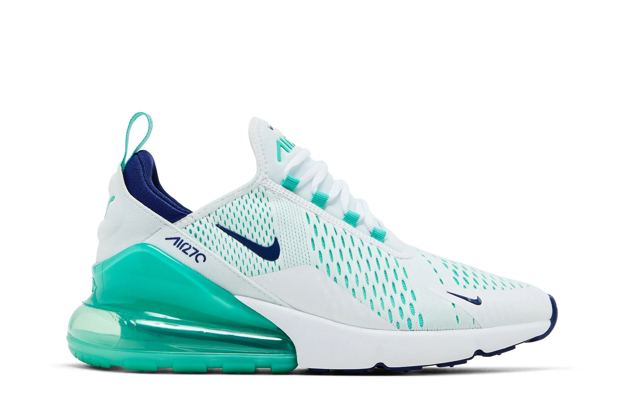 A timeless sports shoe created for off the track, the Air Max 270 strikes a balance of color and technology with this Hyper Jade version. Launched in February 2019, this colorway features a spring palette of White, Hyper Jade and Deep Royal Blue, weaving in modern performance comfort with a large volume 270 Max Air bag.