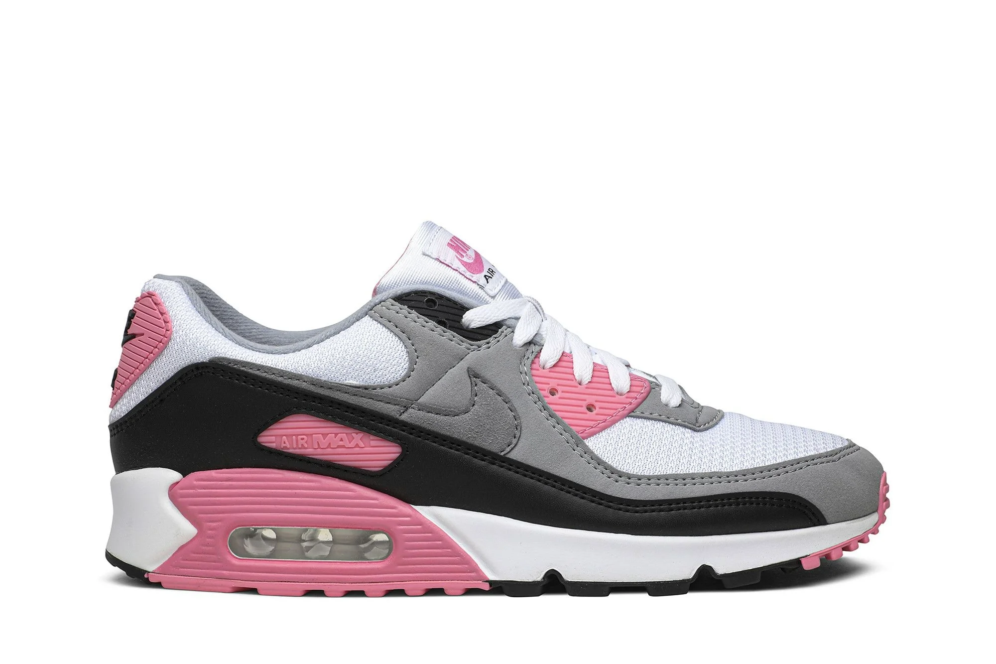 The Air Max 90 'Rose Pink' celebrates the retro runner’s 30th anniversary with OG-inspired color blocking and a recrafted build that’s faithful the original 1990 release. The upper features a white mesh base with grey synthetic suede overlays and a black leather mudguard. Contrasting pops of Rose appear on the sneaker’s TPU accents and midsole wedge, the latter housing a visible Max Air unit for lightweight cushioning. UPPER MATERIAL Mesh