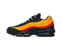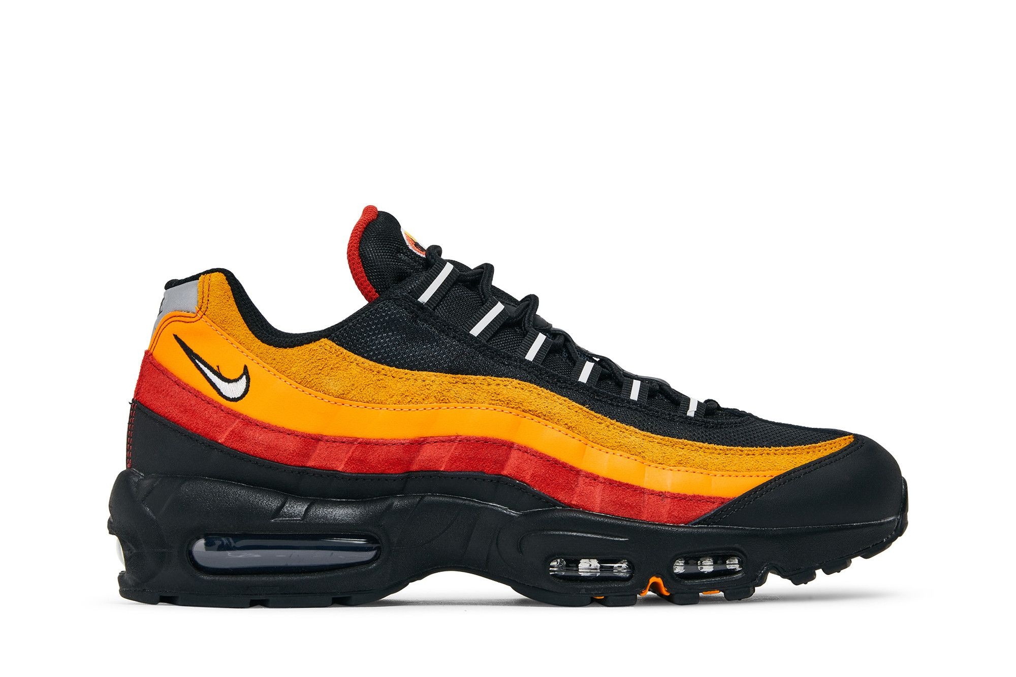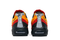 The Nike Air Max 95 ‘Black Kumquat’ showcases sharply contrasting hues on the retro runner designed by Sergio Lozano. The upper combines black mesh with wavy suede and leather overlays in fiery orange and red hues. Webbing lace loops and the molded heel panel are treated to a reflective finish, good for added visibility in low-light conditions. The sneaker rides on a solid black polyurethane midsole, fitted with visible Air-sole units in the forefoot and heel. A waffle-tread rubber outsole delivers grippy traction. UPPER MATERIAL Mesh