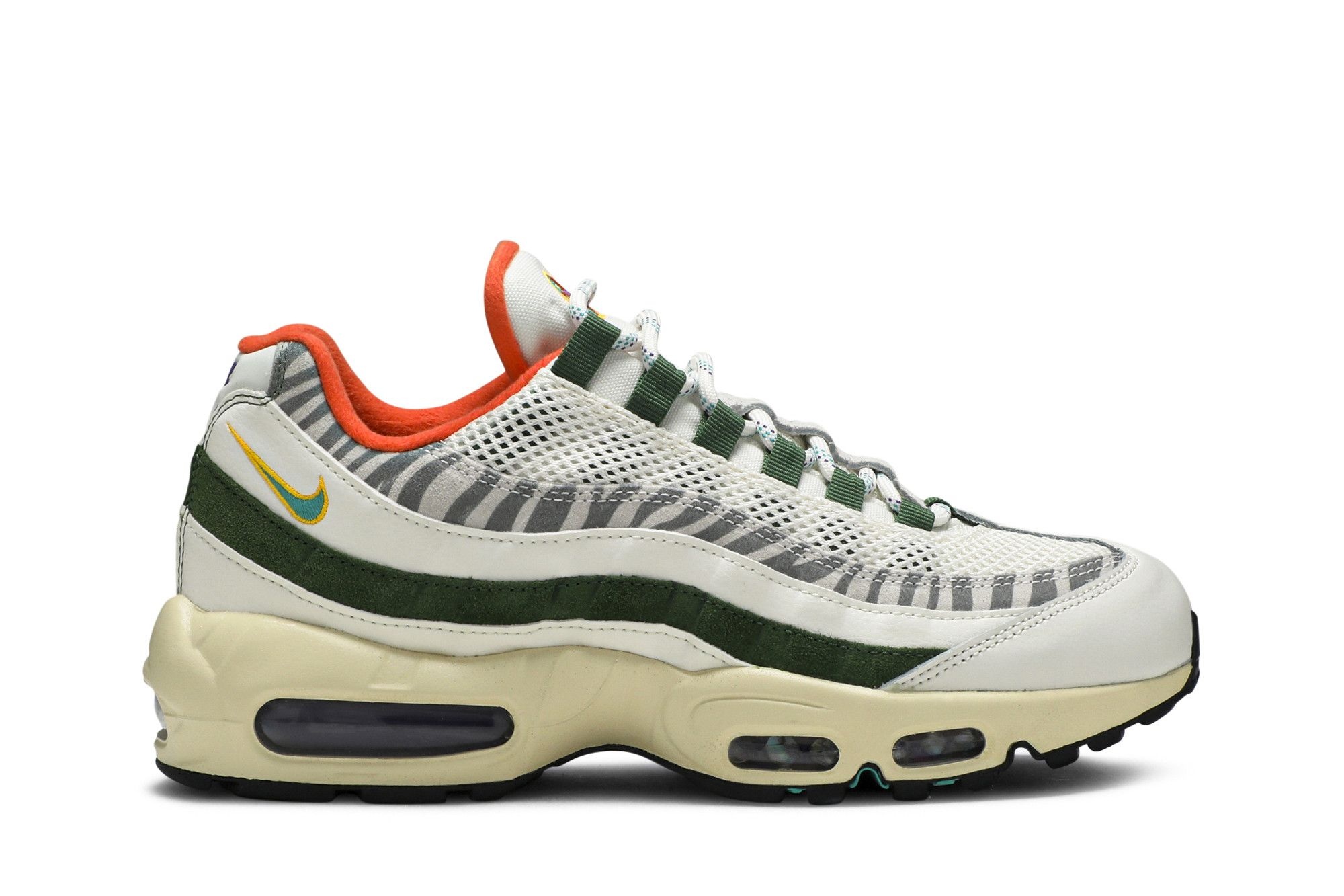 The Nike Air Max 95 ‘Era’ applies animal prints to a retro runner famously inspired by the human anatomy. The signature side panels, marked with wavy overlays replicating the look of muscle fibers, features a mix of white leather, green suede and grey zebra stripes. An interior mesh lining in Electric Orange delivers a vibrant pop of contrasting color, while the Off-White foam midsole contributes to the shoe’s vintage ‘90s aesthetic.