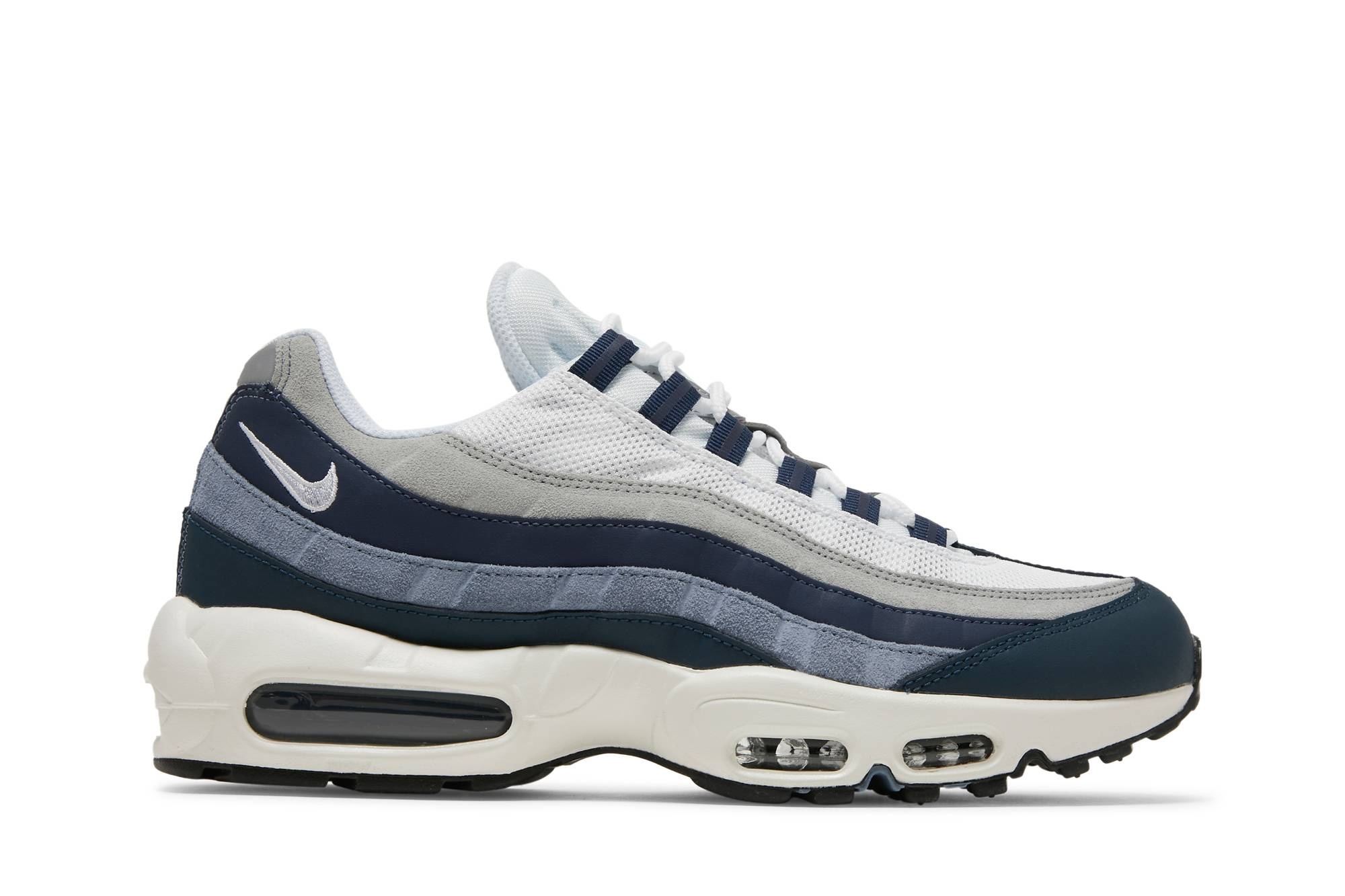 The Nike Air Max 95 ‘Midnight Navy’ showcases chilly hues on a retro runner inspired by the human body. A neutral grey finish joins varying shades of blue on the mixed-material upper, highlighted by wavy leather and suede overlays that represent muscle fibers. Reflective detailing is applied to the lace shroud and molded heel panel, the latter marked with debossed Nike Air branding. The sneaker rides on an off-white polyurethane midsole with visible Air-sole cushioning in the forefoot and heel. Underfoot, a spine-inspired rubber outsole provides grippy traction. UPPER MATERIAL Mesh