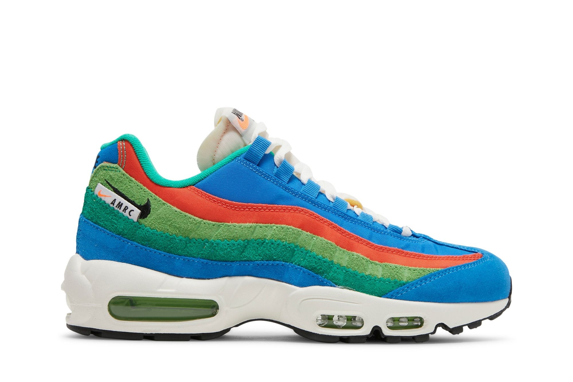 Launching as part of the ‘Air Max Running Club’ collection, the Nike Air Max 95 SE ‘Light Photo Blue’ gives Sergio Lozano’s original design a vibrant makeover. The upper is crafted from blue nylon with wavy side overlays in orange nylon and green suede. The webbing eyelets of the original AM95 remain, but the tongue is updated with exposed foam construction. Affixed to the lateral heel, a woven tag displays ‘AMRC’ branding on the right shoe and ‘BVRTN, OR’ on the left. Lightweight cushioning arrives via a white foam midsole with green-tinted Max Air units under the forefoot and heel. UPPER MATERIAL Suede