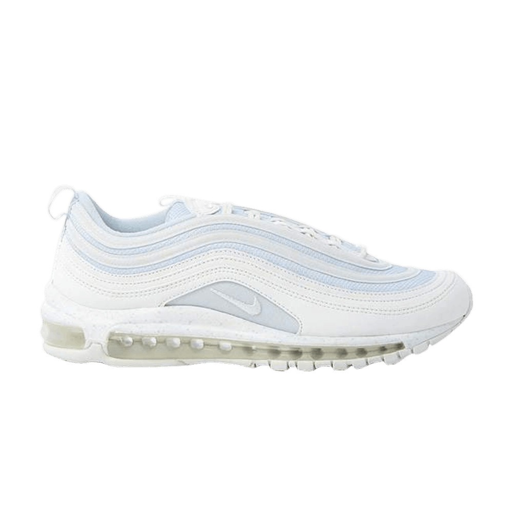 A breezy, pastel take on the ’97 style—this Air Max icon receives a blue tinted makeover for September 2018. The Air Max 97 'Light Blue' sneaker is reimagined in an airy, cloud-like colorway that combines Light Blue mesh uppers with crisp White leather overlays along its Christian Tresser-designed, signature wave pattern. A full-length Max Air unit atop a silver-speckled midsole uphold the legacy of this sleek sneaker.