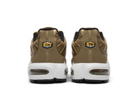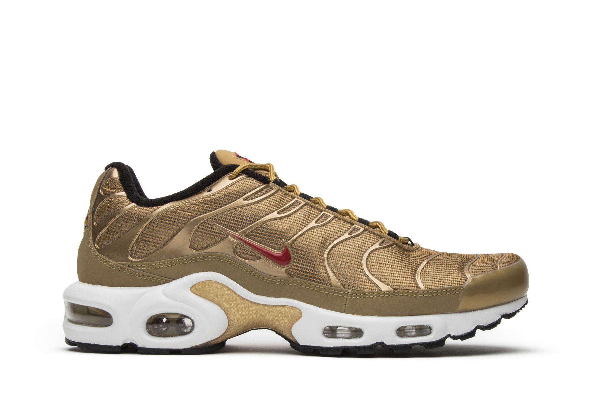 This Nike Air Max Plus colorway features a metallic gold upper with a University Red Swoosh, black eyelets, and a black inner lining. The shoe also comes with a metallic gold Air unit. Released in May 2017 in celebration of the Air Max 97's 20-year anniversary, the shoe dropped alongside a metallic gold Air Max Jewell, a woman's silhouette inspired by the Air Max Plus.
