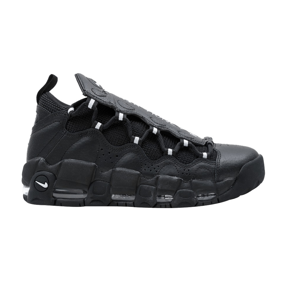 Combining two 90s basketball favorites, the Air More Money features the upper of the Air Money, and the midsole/outsole of the Air More Uptempo. The newest 'Trust Fund Baby' colorway features a black leather upper with white accents including ‘AIR MONEY’ printed on the removable lace guard in a font resembling those found on credit cards. A dollar sign is stitched on the back heel, further cementing the Air More Money silhouette name.