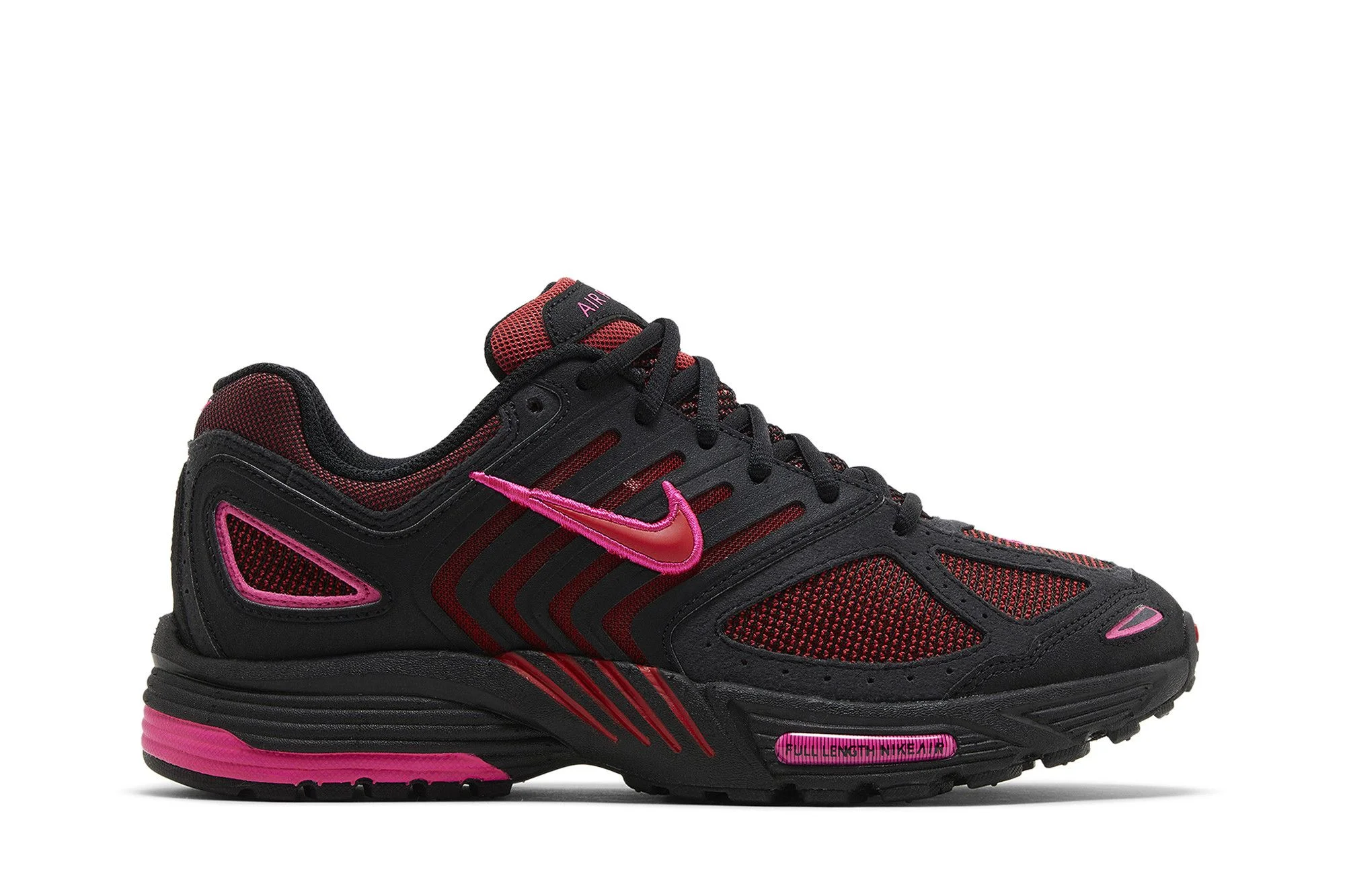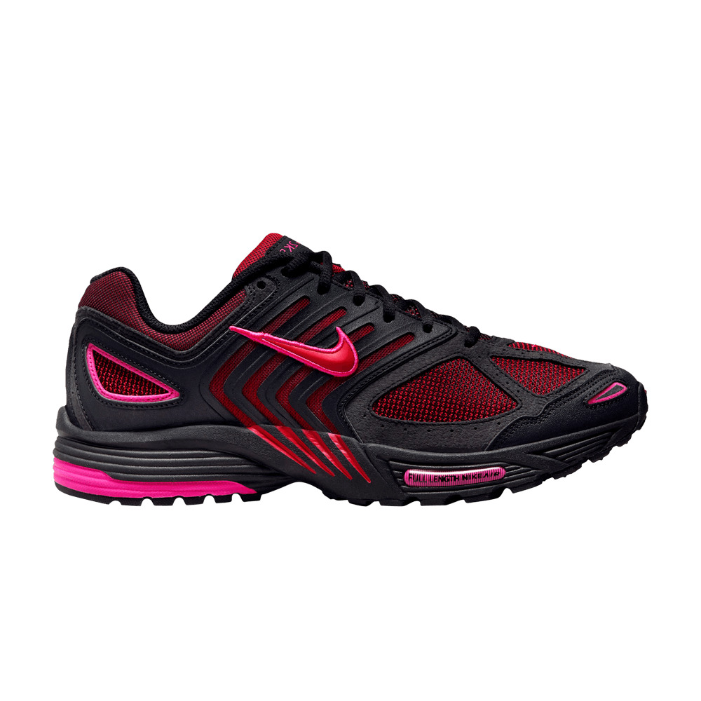 The Nike Air Pegasus 2005 'Black Fire Red' features crimson mesh construction with black synthetic leather overlays. Outlined in hot pink embroidery, a molded scarlet Swoosh decorates the quarter panel. Full-length Nike Air cushioning is housed inside a black foam midsole, accented with contrasting pops of red and pink. Nike's waffle-tread rubber outsole provides grippy traction underfoot. UPPER MATERIAL Mesh
