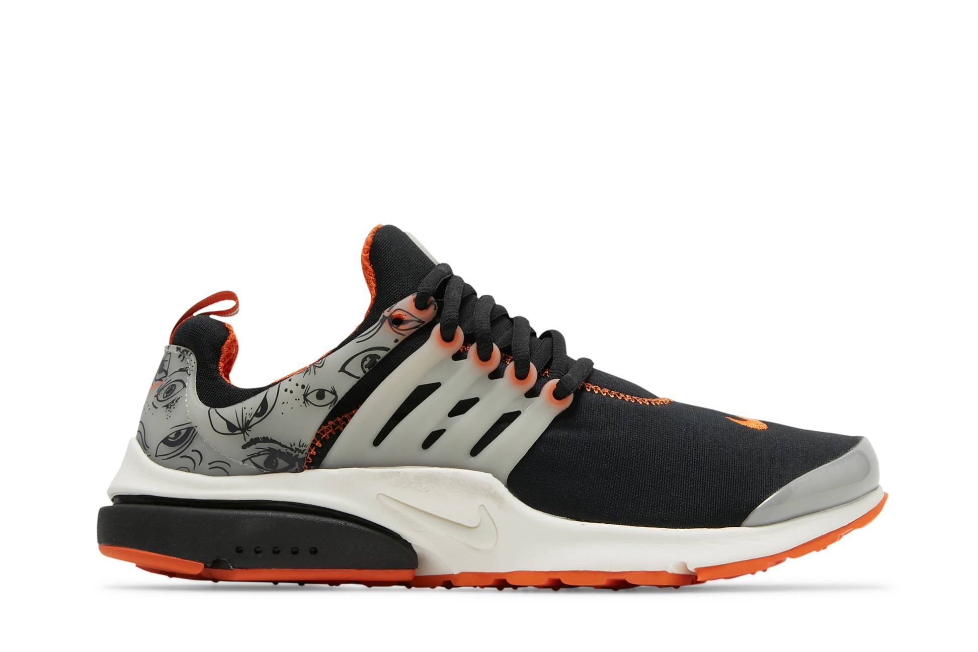 The Nike Air Presto Premium ‘Halloween’ 2021 celebrates spooky season with a suitable color palette highlighted by a black textile upper with contrasting orange accents. The citrus hue appears on the collar lining, webbing pull tabs at the heel, and a pair of mismatched branding elements embroidered on the toe box: a Swoosh on the right shoe and a spider on the left. Adding to the unsettling vibe, the semi-translucent heel cage is covered in an all-over graphic print composed of staring eyes. The sneaker rides on a white and black Phylon midsole with encapsulated Nike Air cushioning in the heel. UPPER MATERIAL Mesh