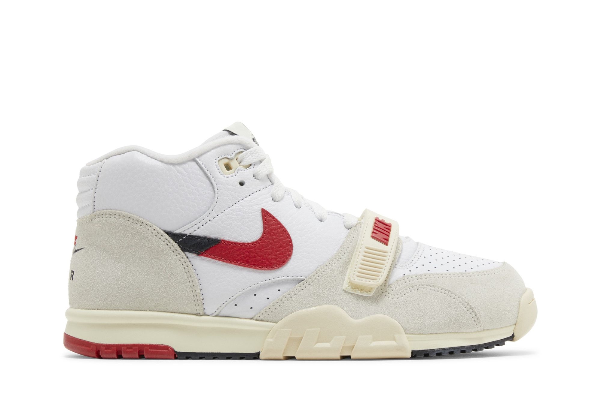 The Nike Air Trainer 1 ‘University Red’ brings back the original cross-training shoe with split logos at the tongue and heel that celebrate the past and present of Nike. The archival silhouette sports a white leather upper, fortified with tonal suede overlays and secured with an adjustable forefoot strap. On the lateral side, a split Swoosh in black and University Red offers a contrasting pop of color. The mid-top rests on a polyurethane midsole, featuring encapsulated Air-sole cushioning and a lateral outrigger for a stable ride. UPPER MATERIAL Leather
