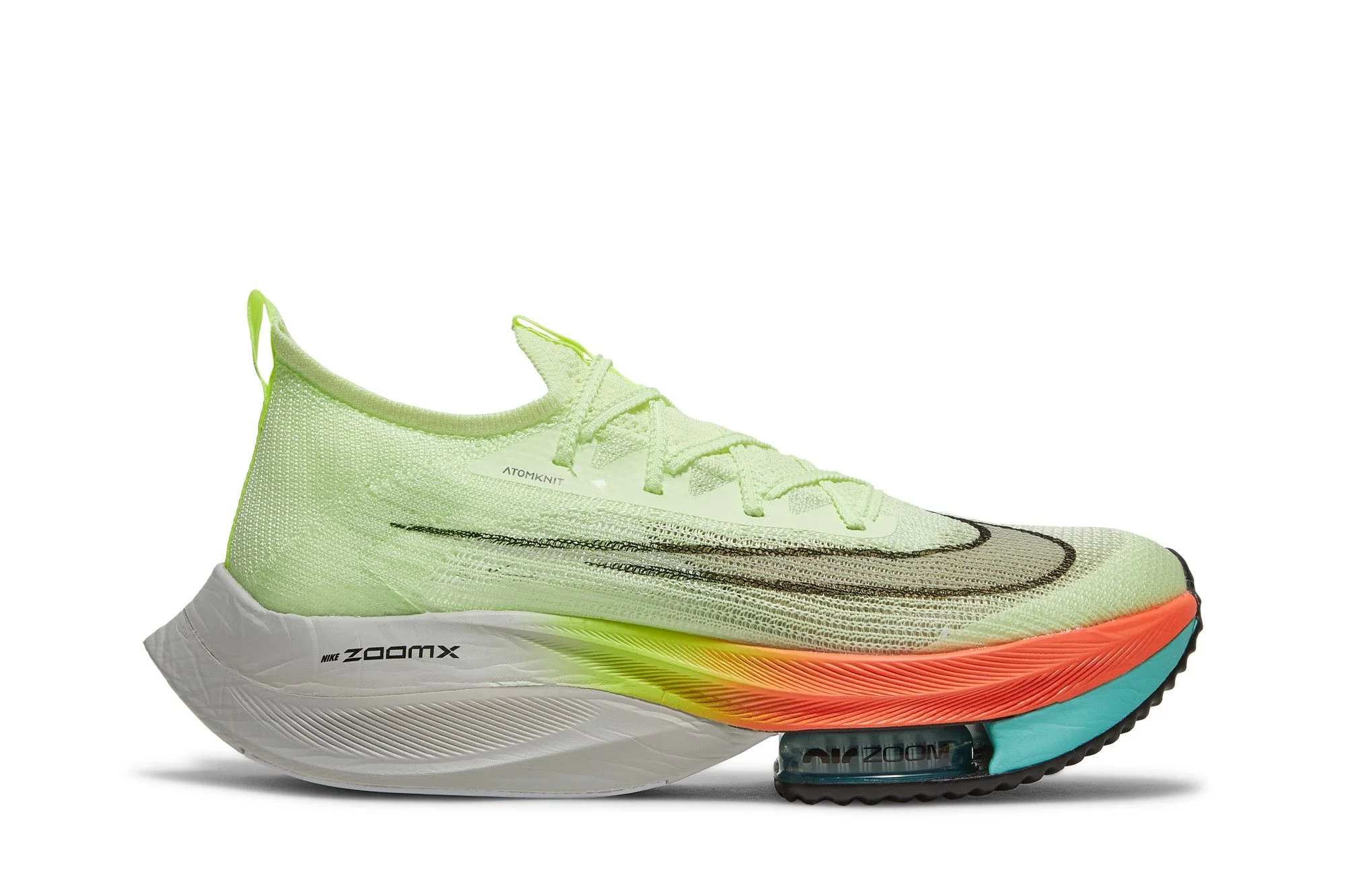The Nike Air Zoom Alphafly Next% ‘Fast Pack’ updates the pinnacle running shoe with an eye-catching color scheme. A neon green hue floods the AtomKnit upper, an evolution of Nike Flyknit that’s more lightweight and breathable. Gradient pastels fade to white on the ZoomX foam midsole, enhanced with a full-length carbon fiber plate and fitted with two visible Zoom Air units under the forefoot. Durable rubber pods are utilized on the outsole, featuring a traction pattern based on data from hundreds of runners. UPPER MATERIAL Atomknit