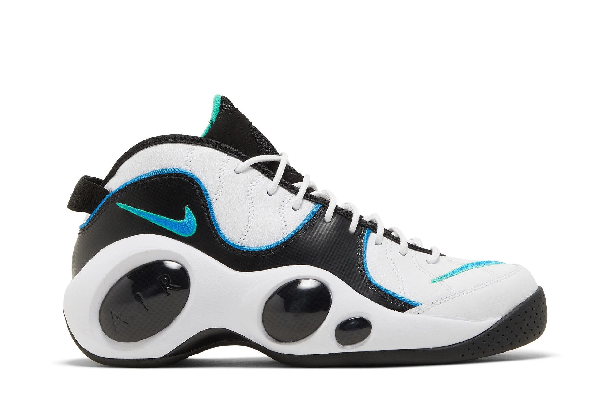 The Nike Air Zoom Flight 95 ‘White Photo Blue’ revives the vintage hoops shoe in a new colorway that recalls Jason Kidd’s PE with the Dallas Mavericks. The white leather upper features stitched lines and a black synthetic leather overlay with contrast blue piping. An embroidered Swoosh decorates the toe box, while webbing pull tabs at the heel are marked with ‘Flight’ branding. The sneaker rides on a sculpted Phylon midsole with a Nike Air unit in the heel and energy-returning Zoom Air cushioning in the forefoot. Spherical ‘bug eyes’ give the shoe its distinctive look while also providing lateral support. UPPER MATERIAL Leather