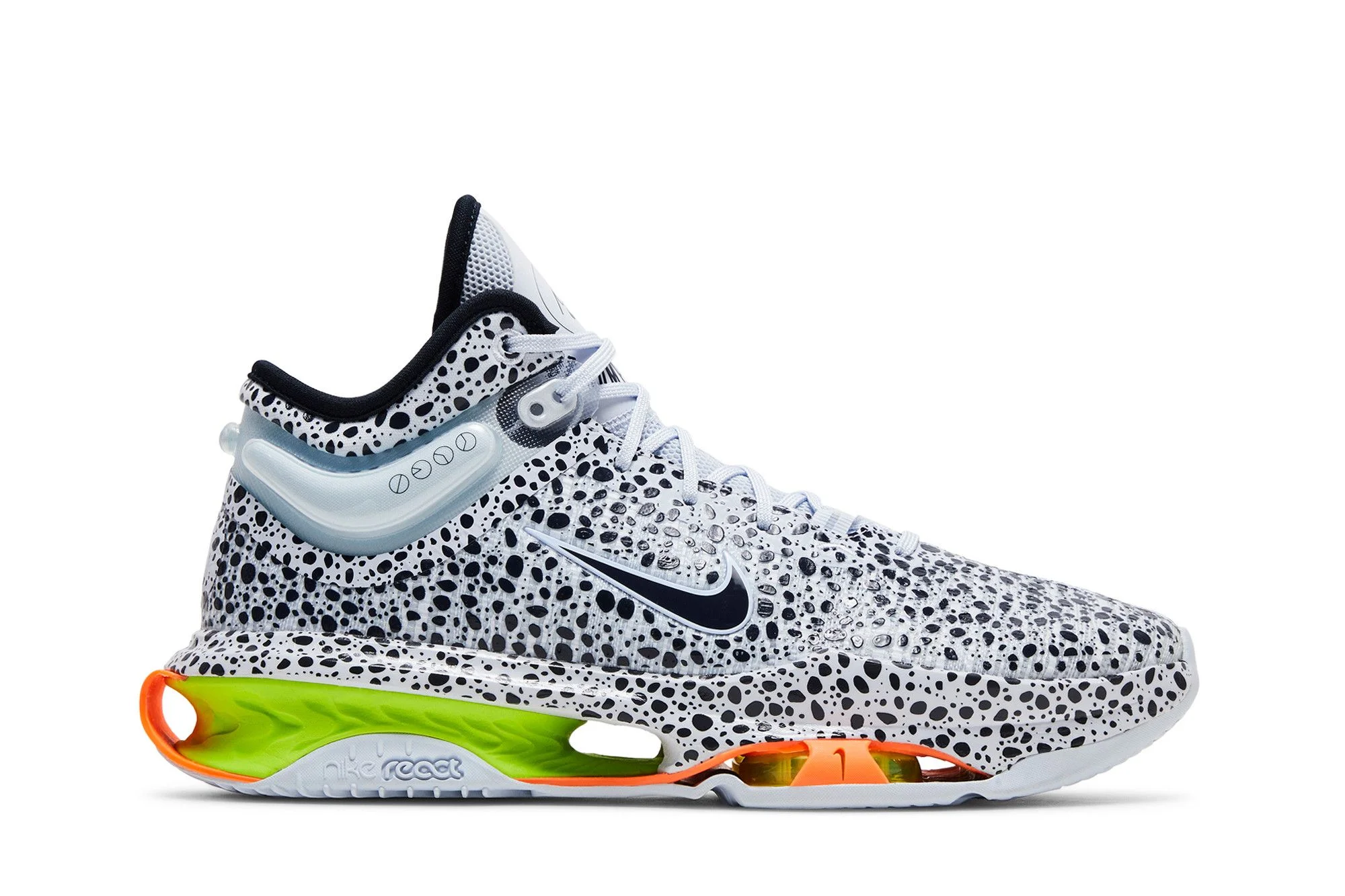 The Nike GT Jump 2 'Electric Pack' delivers a performance hoops shoe celebrating the 2024 Summer Games in Paris. A black-on-white Safari print covers the entirety of the coated mesh upper, featuring a padded mid-cut collar and a lateral-side Swoosh. The all-over pattern extends into the lightweight Phylon midsole, which works with a neon green wedge of Nike React foam in the heel and color-matched Zoom Air units in the forefoot. The latter components are framed in orange rubber for improved stability and support. UPPER MATERIAL Mesh