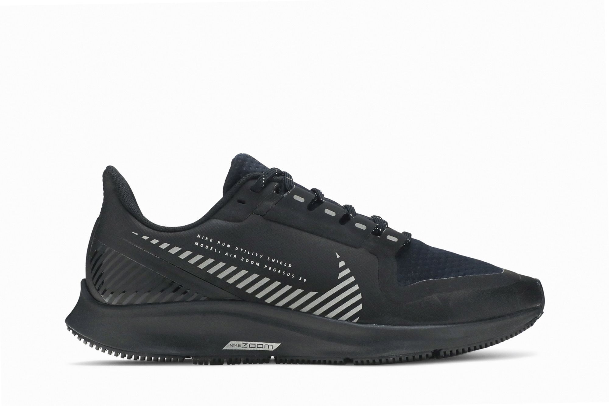 Nike's Air Zoom Pegasus 36 Shield advances the innovative running sneaker with water-repellent functionality. Arrived in October 2019, this version's seam-sealed black knit upper comes clad in lightweight textile designed to shed water, reflective Swooshes and a ghillie lacing system for security. Mil-spec branding is applied across the lateral. While the Zoom Air helps optimize energy return, the rubber outsole improves grip. UPPER MATERIAL Mesh