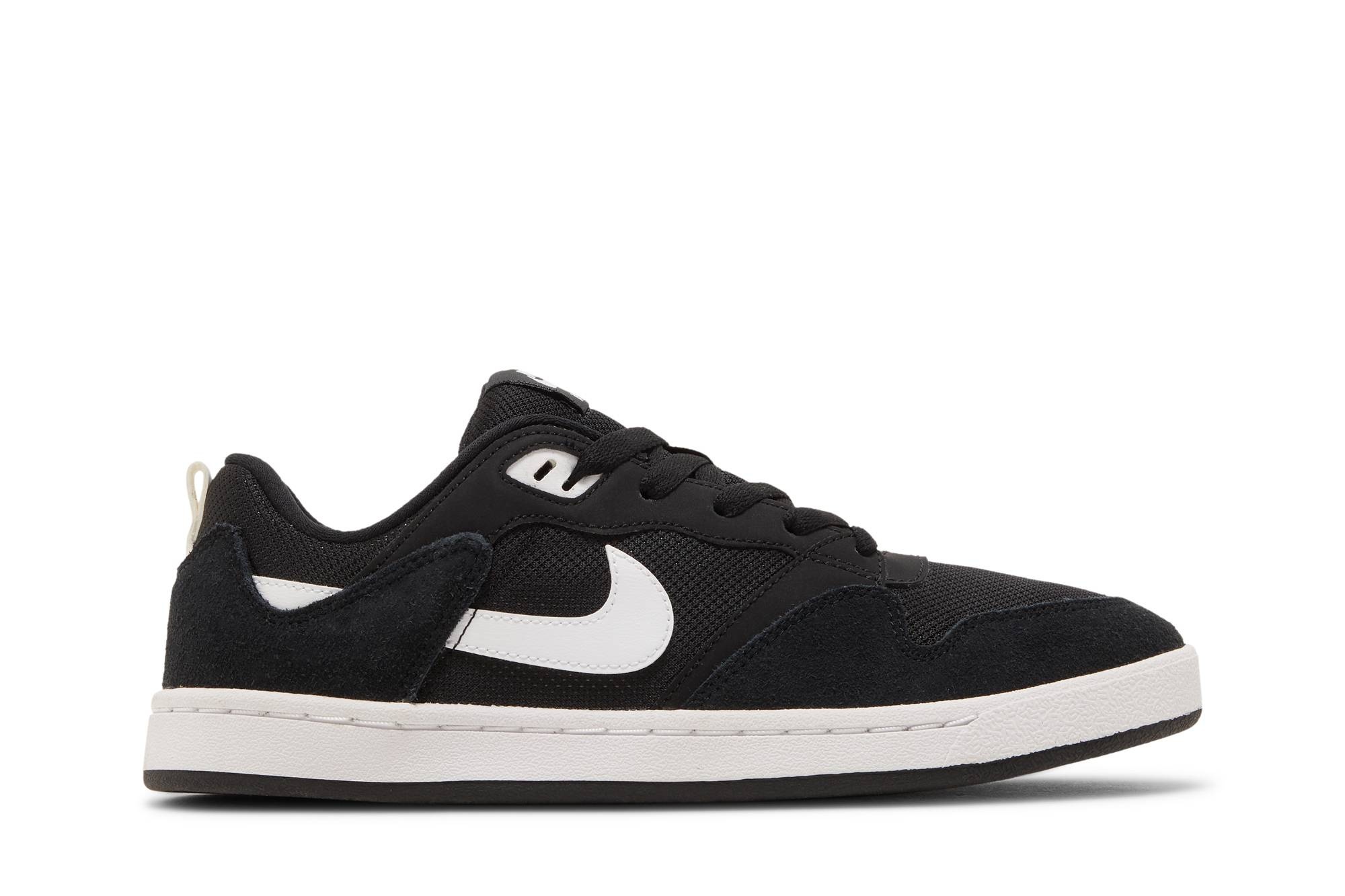 The Nike SB Alleyoop 'Black White' features an essential color scheme on a low-profile skate shoe. The upper is constructed from black mesh with matching suede overlays at the toe and heel. Contrasting white hits appear on the sneaker’s various branding elements, including the Swoosh, Nike tongue tag and SB-branded heel tab. Underfoot, a circular tread pattern on the rubber outsole provides grippy traction.