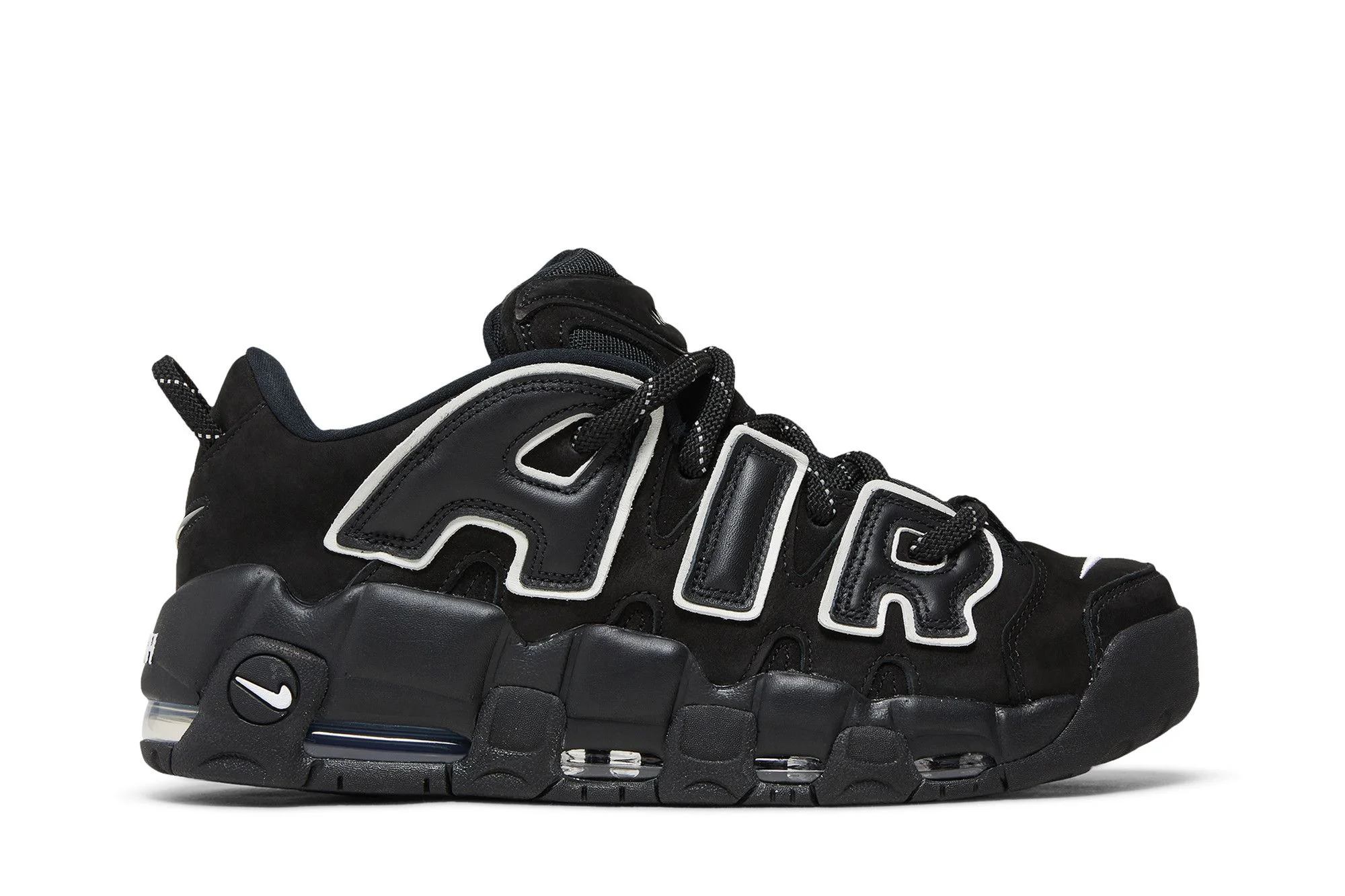 The AMBUSH x Nike Air More Uptempo Low ‘Black’ presents Yoon Ahn’s modern interpretation of the vintage basketball silhouette. Inspired by a chunky 2000s skate shoe, the low-top sports a black nubuck upper with signature ‘AIR’ branding in black leather letters outlined in white trim. ‘AMBUSH’ is inscribed on the tongue, while a jeweled Swoosh adorns the back heel. The sneaker rests on a matching black Phylon midsole, marked with an embossed AMBUSH wordmark at the rear and fitted with visible Air-sole cushioning for a comfortable ride. UPPER MATERIAL Nubuck