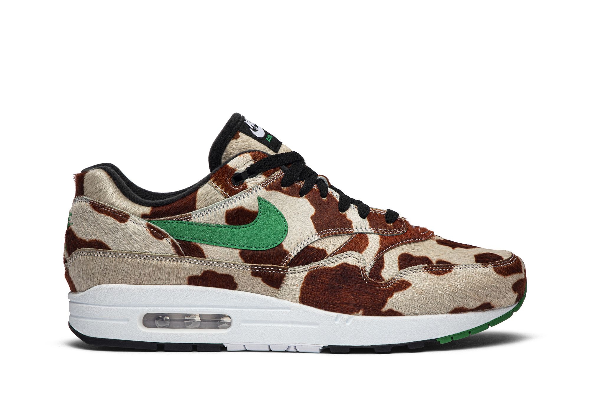 Dynamic duo Nike and beloved Japanese retailer, atmos, team up once again to release the atmos x Air Max 1 DLX 'Animal Pack - Giraffe' sneaker, offered as part of a three-shoe pack released online and at Chicago’s ComplexCon in July 2019. The revamped shoe sports paneled overlays dressed in giraffe-printed pony hair. Bold contrast Swooshes at the midfoot accent the exterior along with additional green detailing on the tongue tab and outsole. The classic visible Max Air unit rounds out the look.