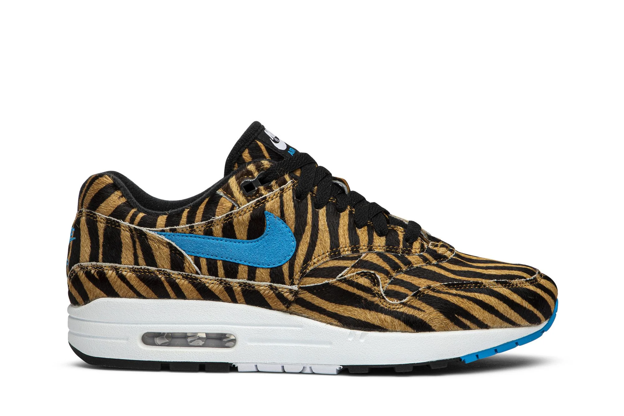 Nike and frequent collaborator atmos, a Japanese retailer, dropped the Air Max 1 DLX Animal 3.0 pack in July 2019 online and at Chicago’s ComplexCon later that month. Included in the collection is the Nike Air Max 1 DLX Tiger sneaker, which features layered overlays covered in tiger printed pony hair. Vibrant contrast Swooshes accent the midfoot along with additional blue detailing on the tongue tab and outsole. Below, this model retains the 1987 OG’s signature visible Max Air tooling and rubber outsole.