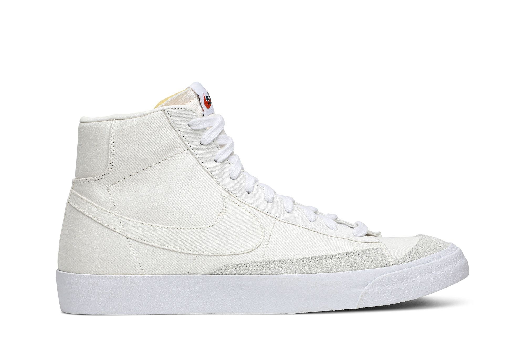 Based on heritage hoops shoes from the 70s and 80s, the Nike Blazer Mid '77 Canvas 'Canvas Sail' features a high top upper in a white, vintage-style canvas. The deconstructed tongue, OG tongue patch and hairy suede overlays add detail, while the autoclave midsole is fused to the upper for an old-school look. The words 'Blazer' and '1977' are printed on the left and right back ankle, respectively.