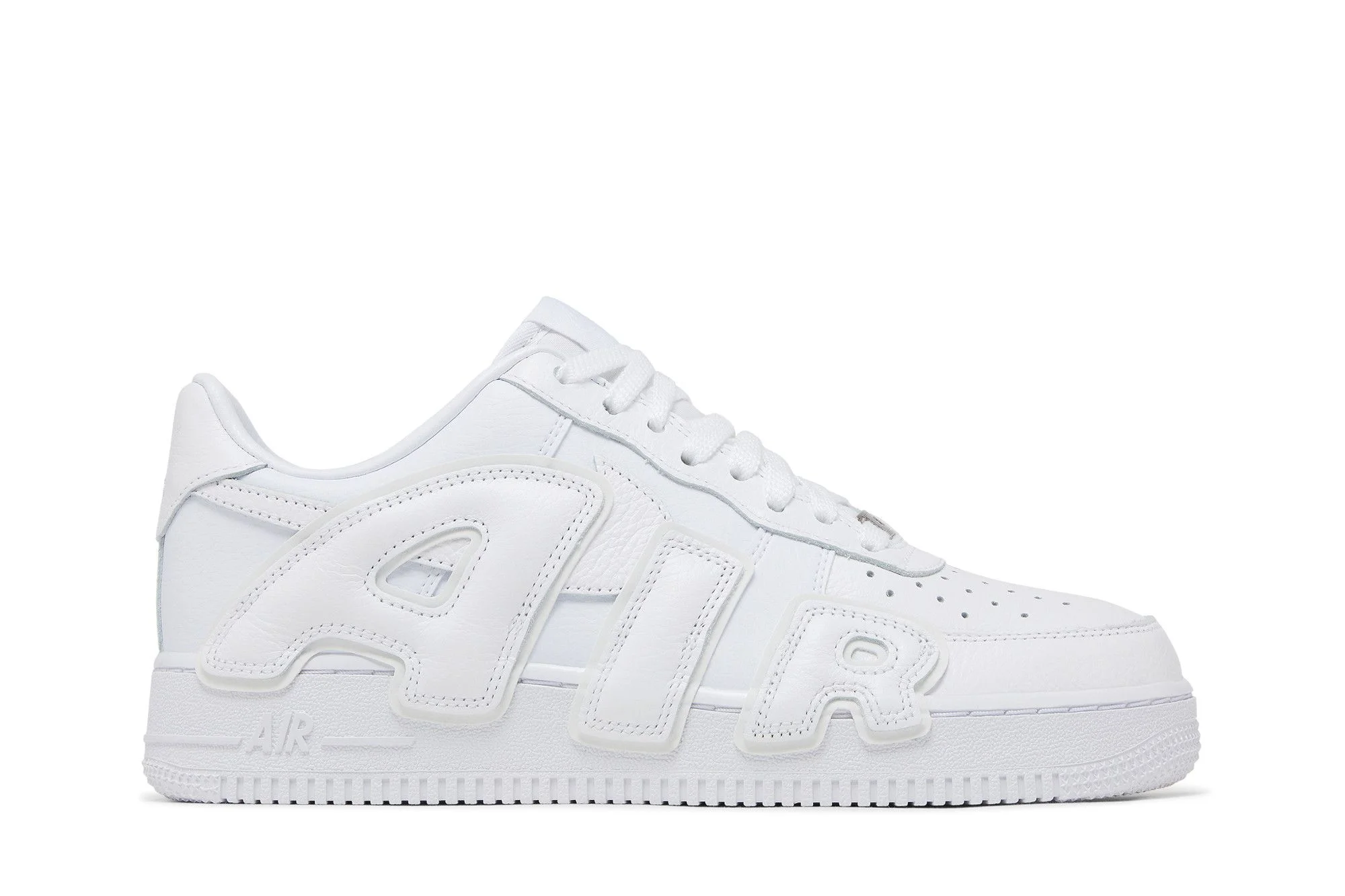The 2024 reissue of the Cactus Plant Flea Market x Nike Air Force 1 Low Premium 'White' utilizes a white tumbled leather upper marked with oversized letters inspired by the Air More Uptempo and outlined in reflective detailing. 'AIR' is spelled out on the lateral side of the right shoe, while 'SUNSHINE' wraps around the upper of the left shoe. A durable rubber cupsole, enhanced with Air-sole cushioning in the heel, maintains the monochrome design. UPPER MATERIAL Leather